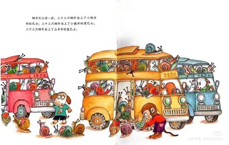 蜗牛们上前一拦,三十三只蜗牛坐上了小狗开的红巴士;三十三只蜗牛坐上了小猴开的黄巴士;三十三只蜗牛坐上了山羊开的蓝巴士。