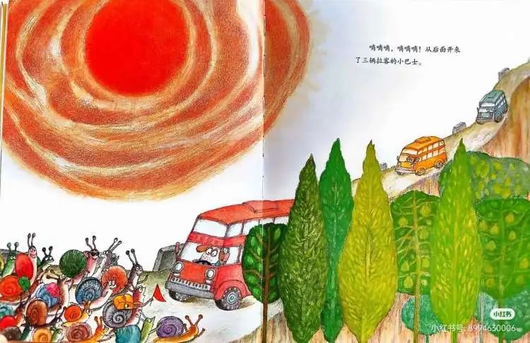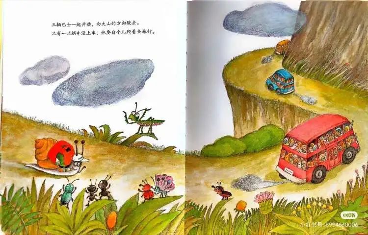 三辆巴士一起开动,向大山的方向驶去。只有一只蜗牛没上车,他要自个儿爬着去旅行。