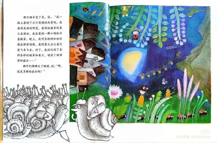 蜗牛们都睁大了眼睛,说:“啊,这是多棒的旅行啊!”