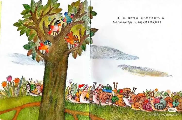 有一天,田野里的一百只蜗牛去旅行。他们听飞来的小鸟说,大山那边的风景美极了!