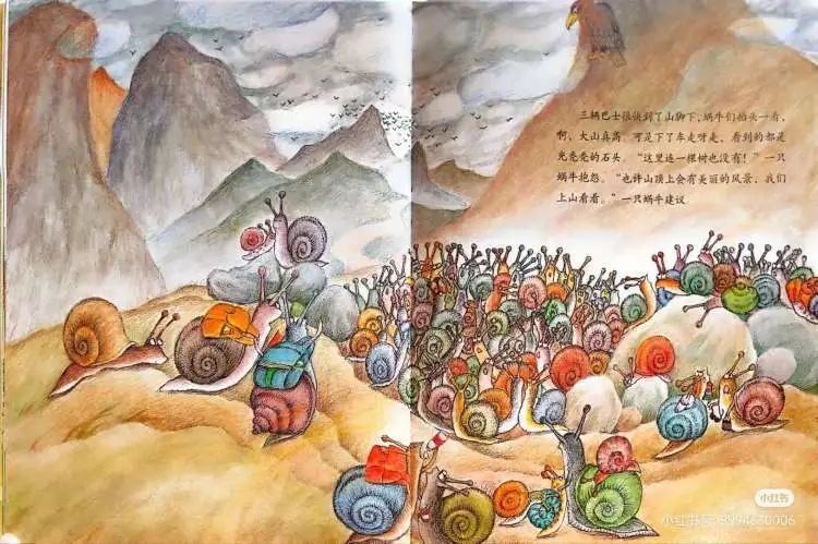 三辆巴士很快到了山脚下,蜗牛们抬头一看,啊,大山真高。可是下了车走呀走,看到的都是光秃秃的石头。 “这里连一棵树也没有!”一只蜗牛抱怨。“也许山顶上会有美丽的风景,我们上山看看。 一只蜗牛建议