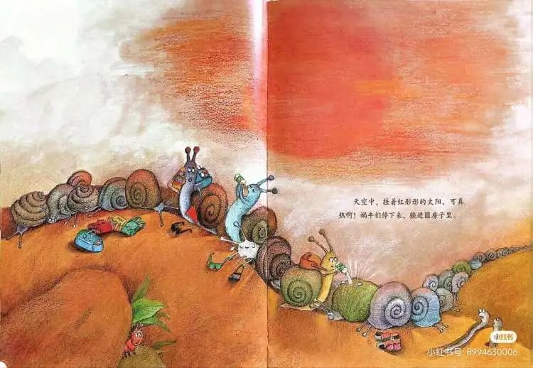 天空中,挂着红彤彤的太阳,可真热啊!蜗牛们停下来,躲进圆房子里。