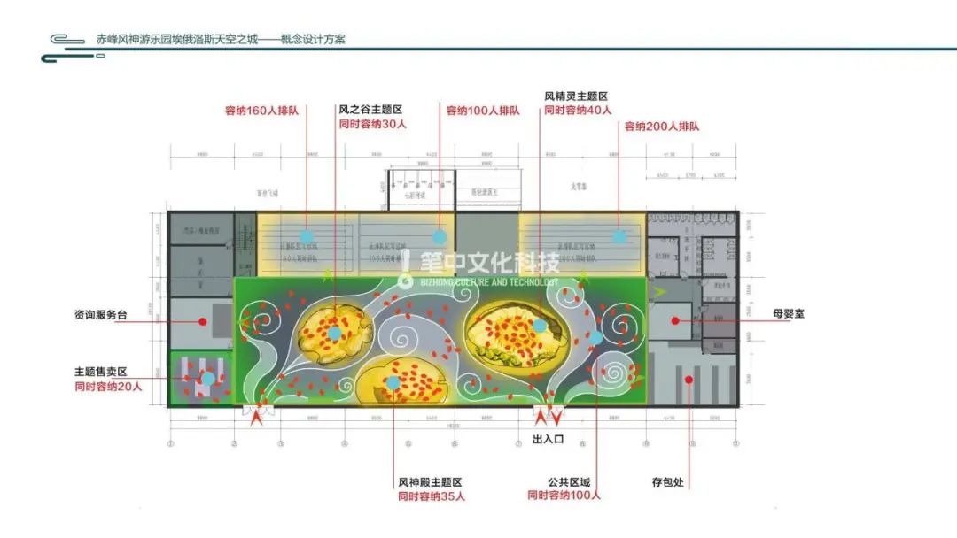 因此笔中文化科技集团对于赤峰风神游乐园埃俄洛斯天空之城的设计,从整体上是满足于游客体验为主,随着人们对不同程度的娱乐性倦 怠,随之需要以故事化、沉浸式互动主题来满足游客的刺激和兴奋。