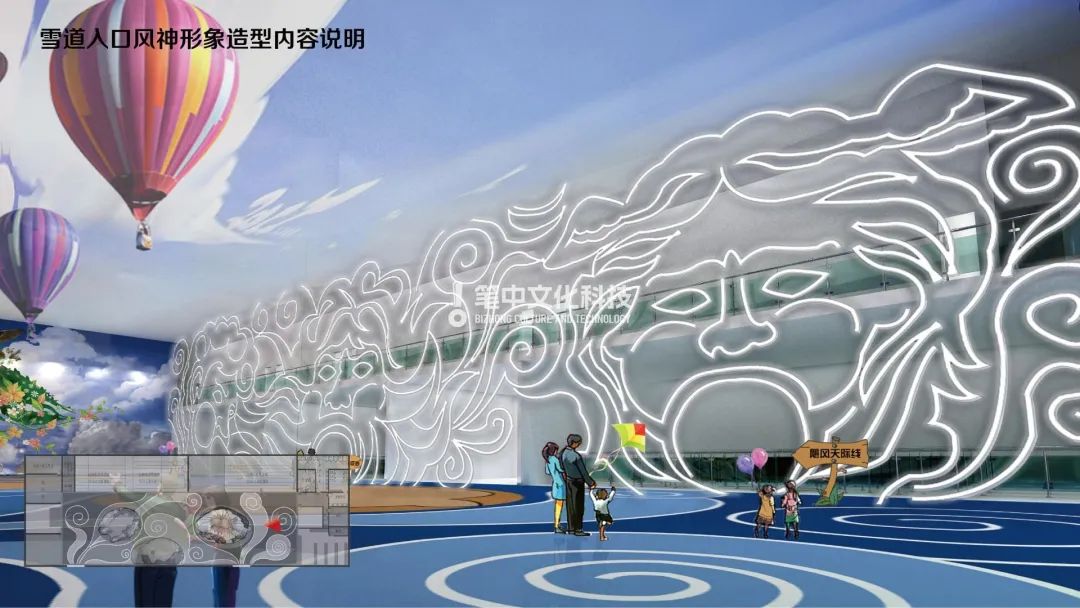 雪道入口风神形象造型,通过三大风神的头部形象进行抽象画处理,将三个风神的口部出风口作为游乐项目入口,简约且具有神秘色彩。
