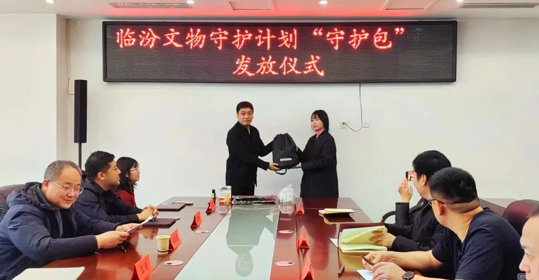捐赠仪式上,中华思源工程基金会王剑为文保员代表发放守护包。市文化和旅游局副局长李刚为字节跳动跳跳糖员工公益临汾文物保护志愿服务队授旗、颁发聘书和工作证。