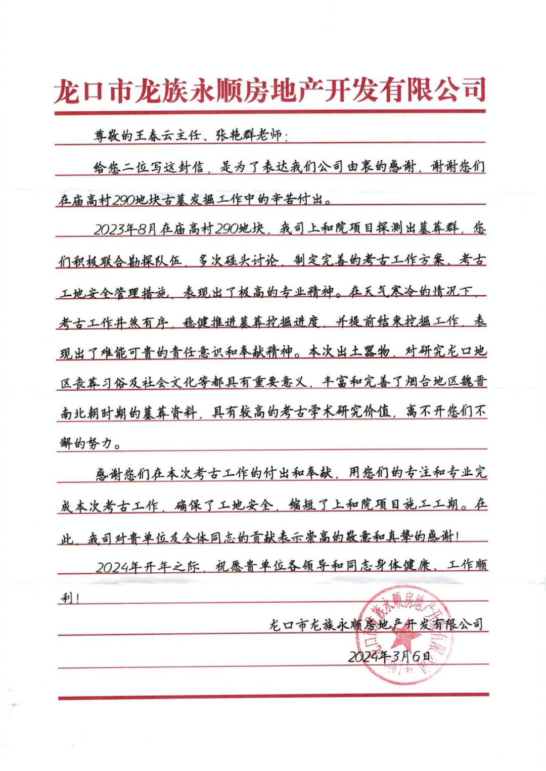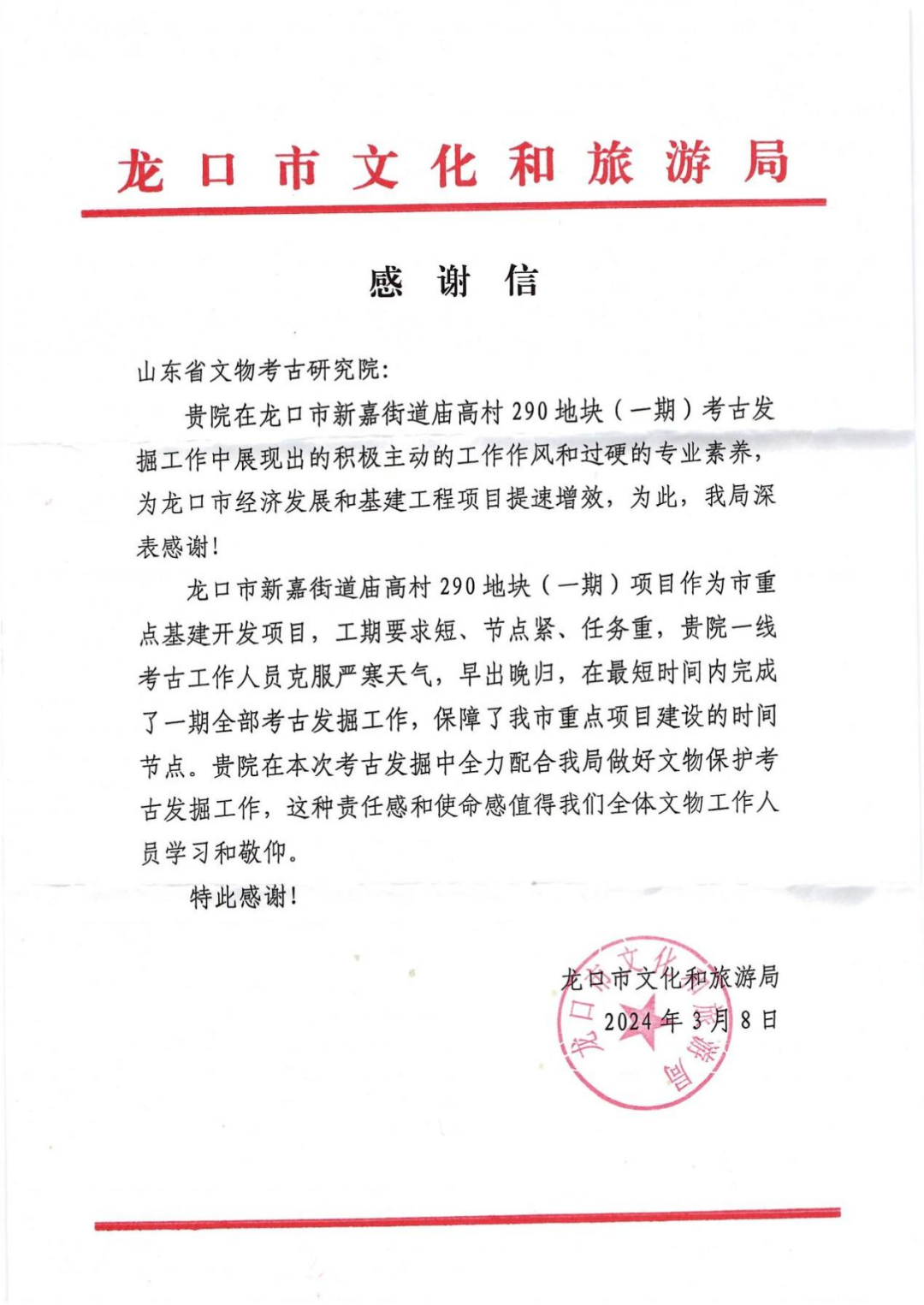 为感谢我院在最短时间内高质量完成龙口庙高村墓地考古发掘项目,给当地基建工程提速增效。3月8日上午,龙口市文化和旅游局,龙族永顺房地产开发有限公司等一行3人来我院合作交流,并为我院送来了感谢信和锦旗。我院党总支书记、院长孙波,专职副书记孔胜利,龙口庙高村墓地考古发掘领队王春云副主任,执行领队张艳群研究员参加交流。