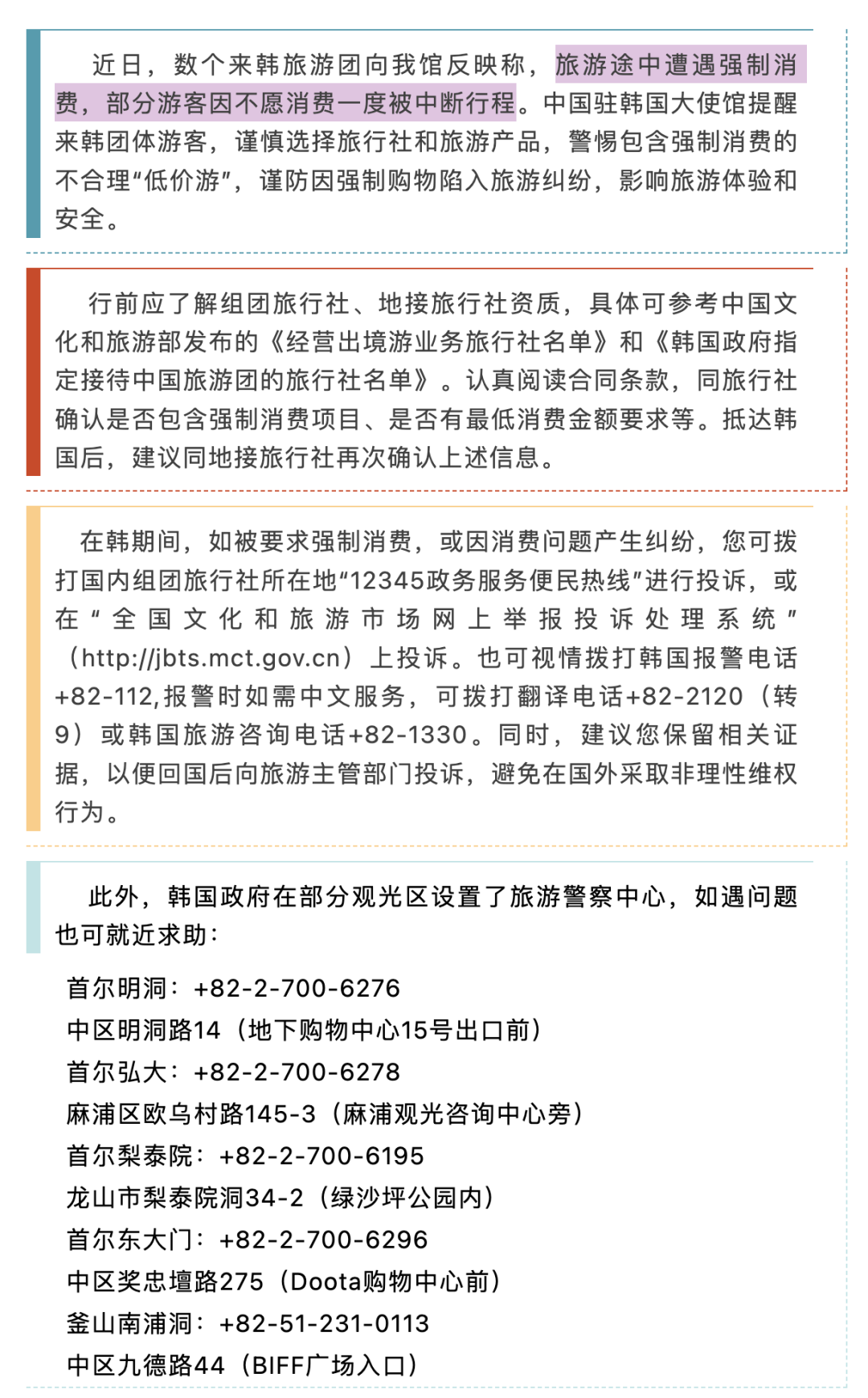 使馆提醒大家谨慎选择旅行社和旅游产品,警惕包含强制消费的不合理“低价游”,认真阅读合同,确认清楚是否包含强制消费项目、是否有最低消费金额要求等,抵达韩国后,建议同地接旅行社再次确认上述信息