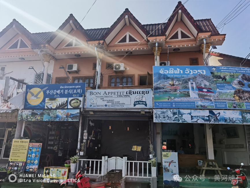 告别了这位中国同胞,我继续在万荣觅寻我感兴趣的景观风貌,万荣虽然只有一条主干街道,但是小巷道还是不少的。沿街五颜六色的招牌上,老挝文,英文,发文,韩文,中文交相辉映,如果你只看招牌,还以为走进了一个国际大都市。只是马路两边裸露的泥土,坑洼不平的道路,简易低矮的房子则让你明白这不过是东南亚一个落后的农业国,尽管百姓的幸福感很强,走在大街上的游客更觉得这里有种神奇的魔力。我在这个犹如中国普通乡镇的县城(从谷歌上搜索了一下发现,这个万荣已经改市了,是万象省的省会,而不是导游说的万荣县)竟然发现了一所大学,仔细一看旁边的老挝与英文说明,原来这所学习还是老挝教育部与德国、瑞士联合办的一所酒店技术大学。当然这个学校外表看起来就像一个普通的乡镇中学,仅仅只有两三栋五六层高的普通楼房。在夜市街我们还发现了一处国际联合银行的营业厅,还有中国远征军餐厅的标志,这无疑说明这座小城其实有着相当丰富的“内涵”。当然要说起来,比较特别的还是河面上几座用木杆加起来供行人和摩托车通过的简易大桥以及众多坐落在街道、商业区、居民区的礼佛堂。