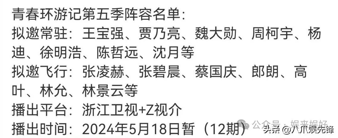 既然投入增大,自然期望的回报也会增长,因此对于节目而言,必然需要好的阵容来搭配好的方案,这次《青春环游记5》不仅曝光了拟邀常驻名单,还顺带说了拟邀的飞行嘉宾,为的就是想要在节目前期就靠嘉宾留下观众。