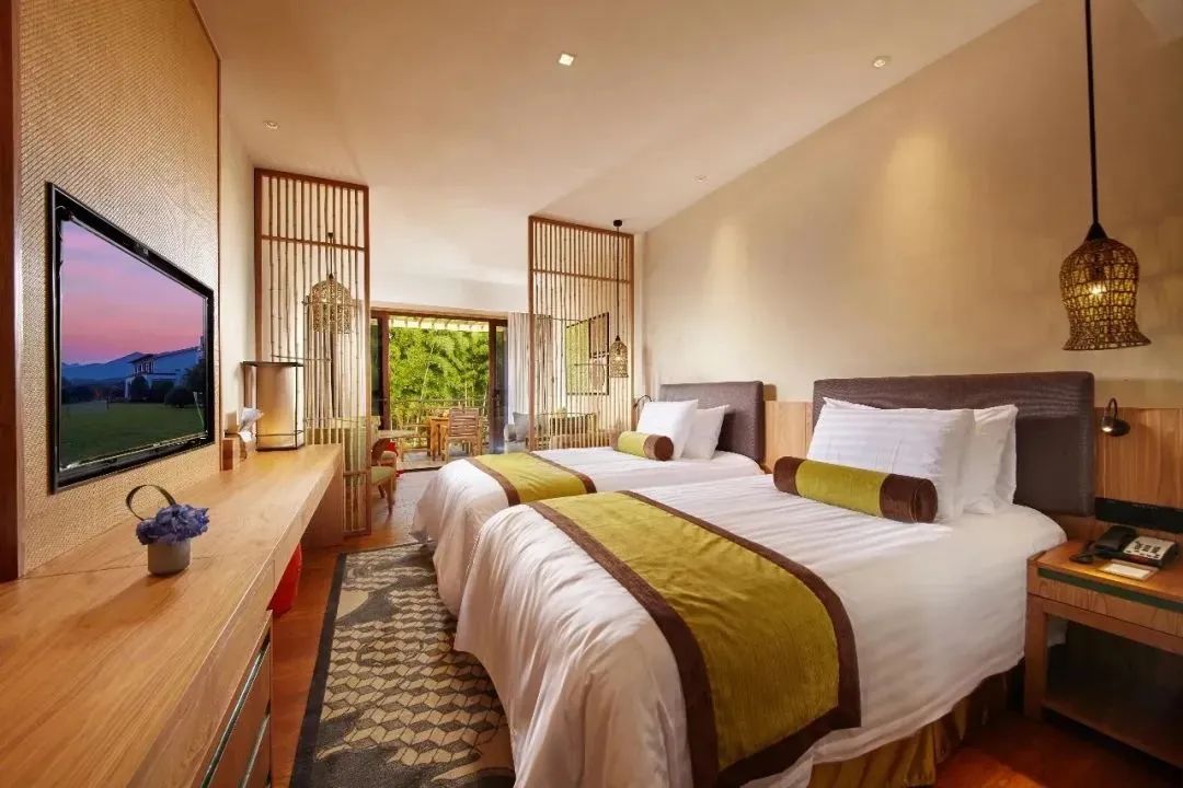 本次套餐房型为芳草地双床别墅,面积41㎡,含两张1.2m单人床,隐于竹林中,推窗即是让人上瘾的满眼青翠;置身房间,则是原木、现代而又略带人文情怀的感觉弥漫在周围。