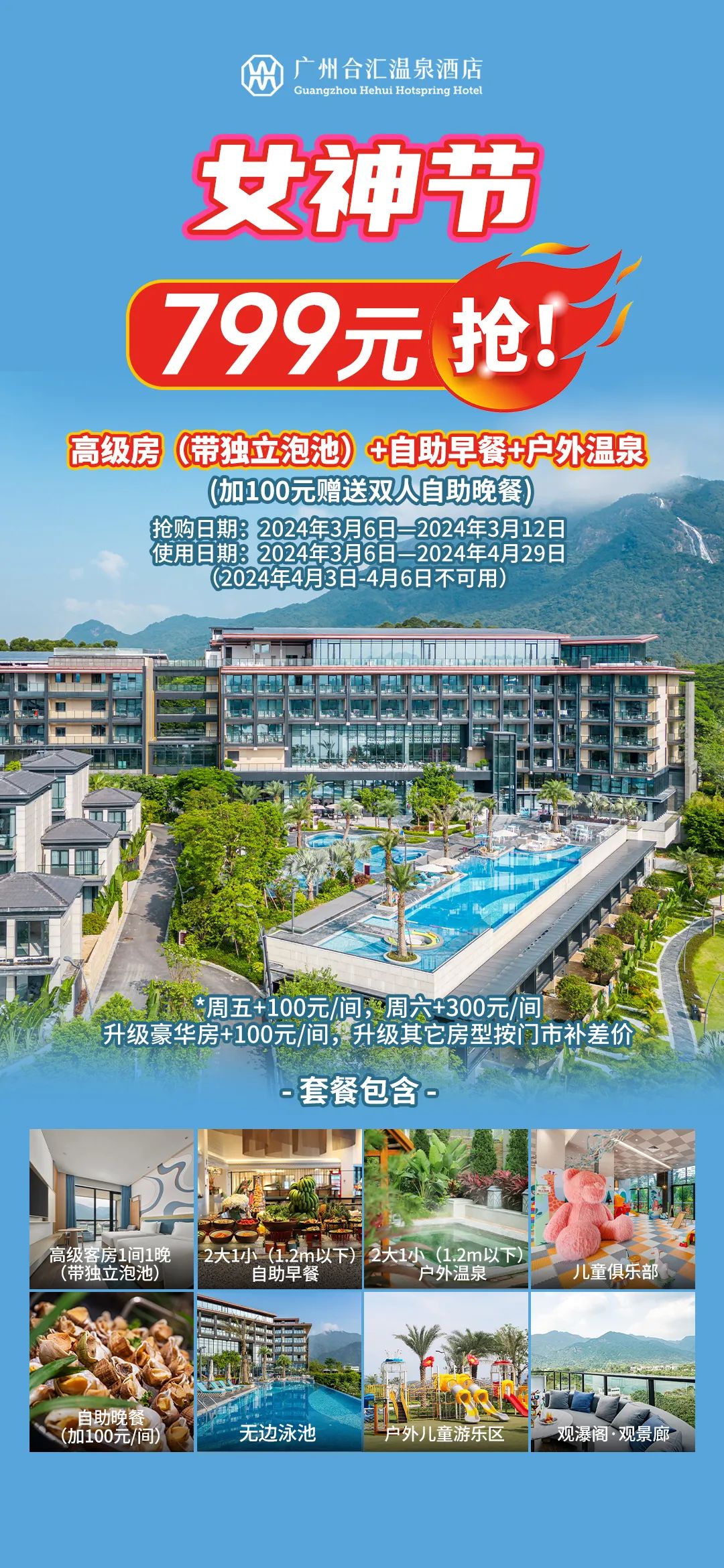 【广州合汇温泉酒店】女神节特惠,799元/套起入住高级房,含双早+双温泉,+100/间升级双人自助晚餐
