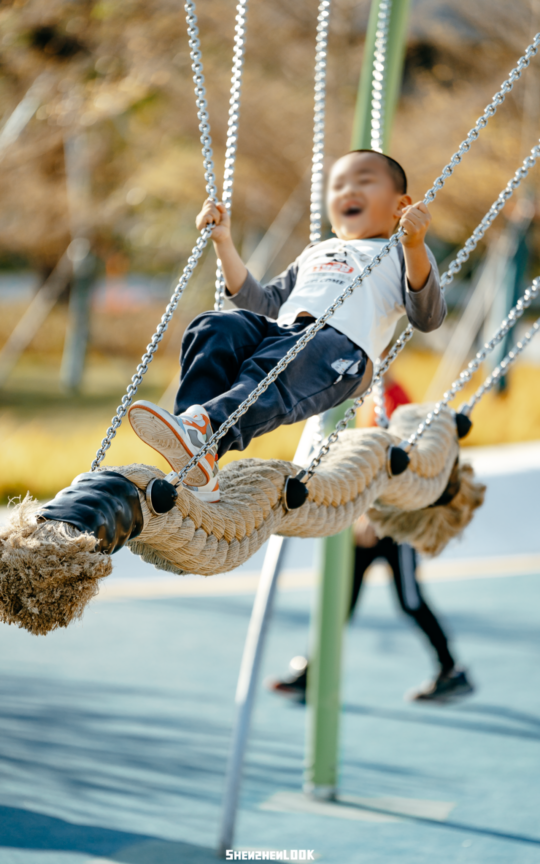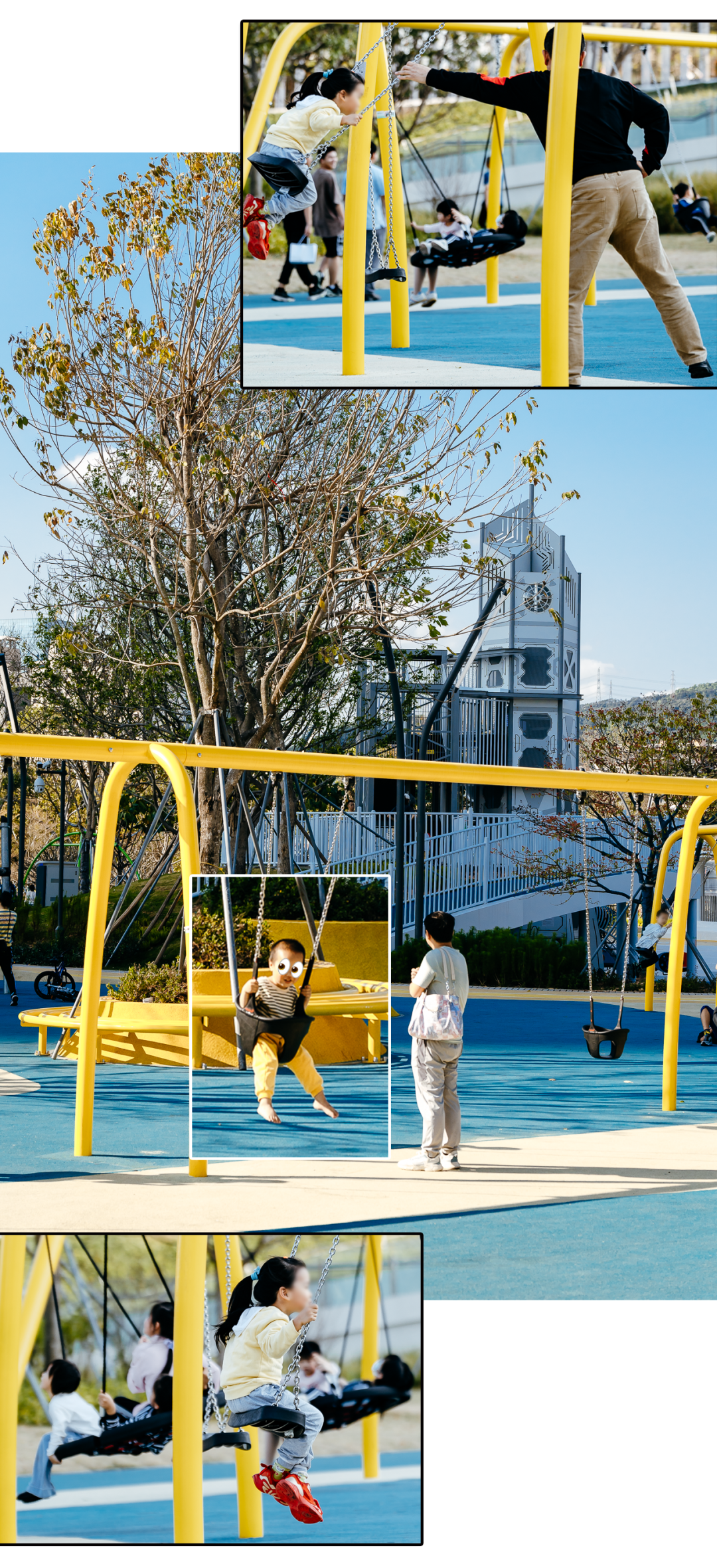 乐园里的秋千分幼童座椅型、大小朋友适宜凳型、还有可以躺的网兜型。秋千区也是这里最热门最“难排”的区域。