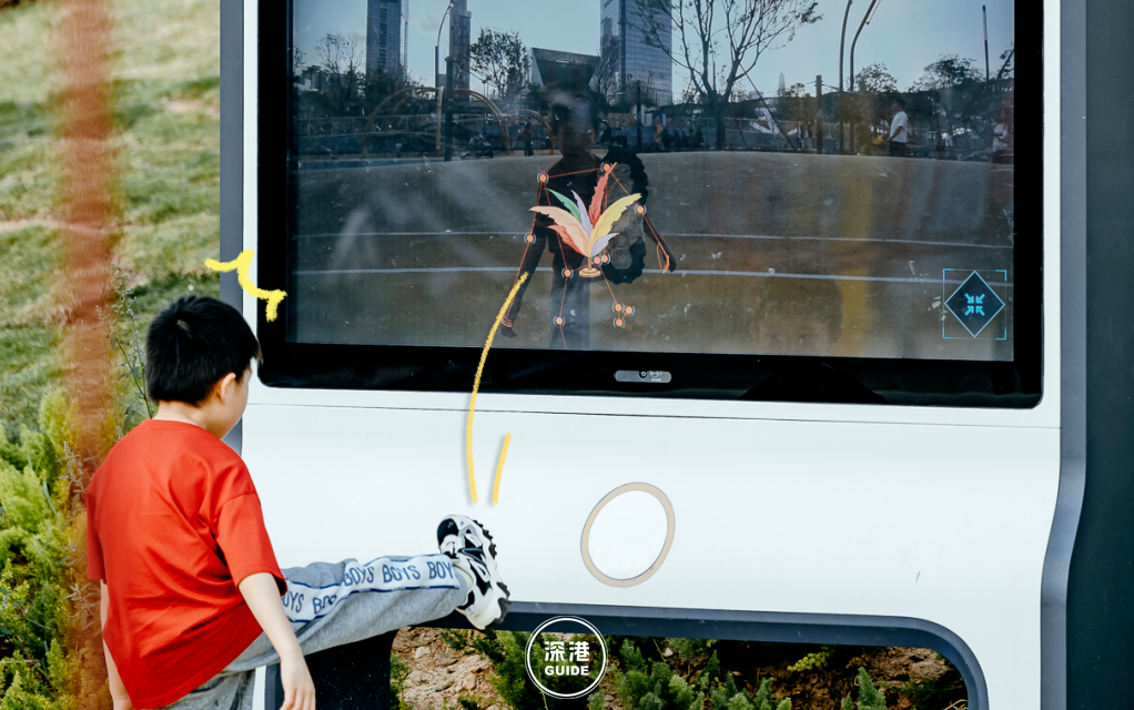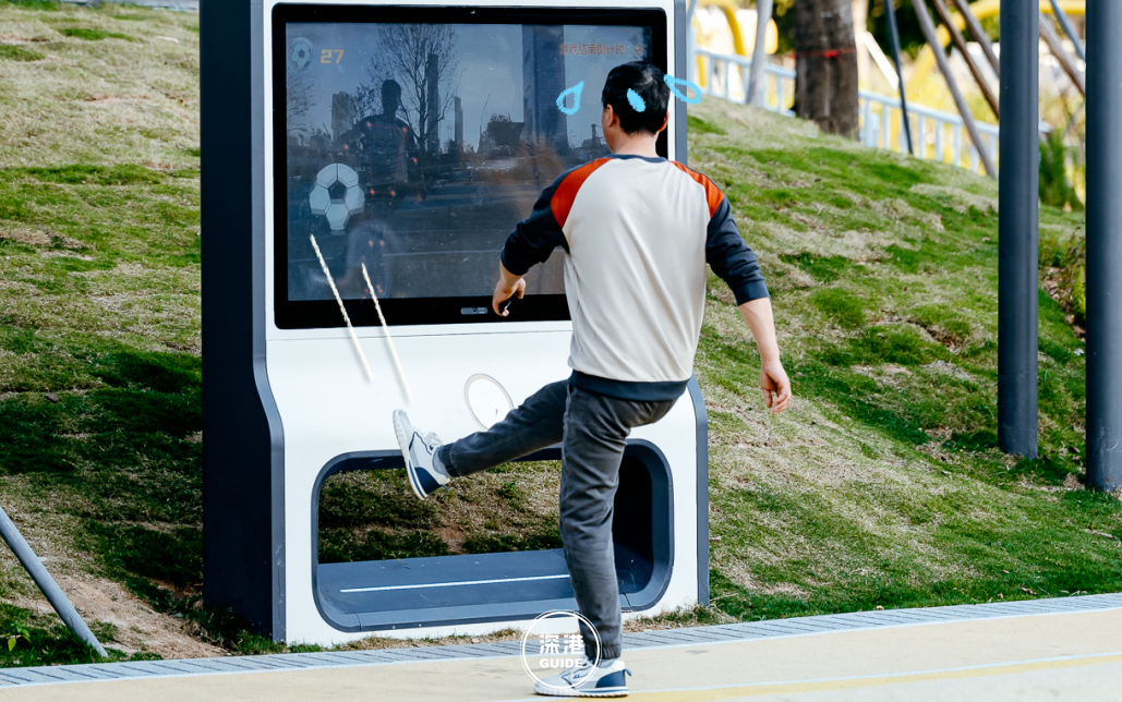 从滑梯下来,瞧见两台大型体感游戏机放置于跑道上,这算是在公园里少见的「新玩意儿」。