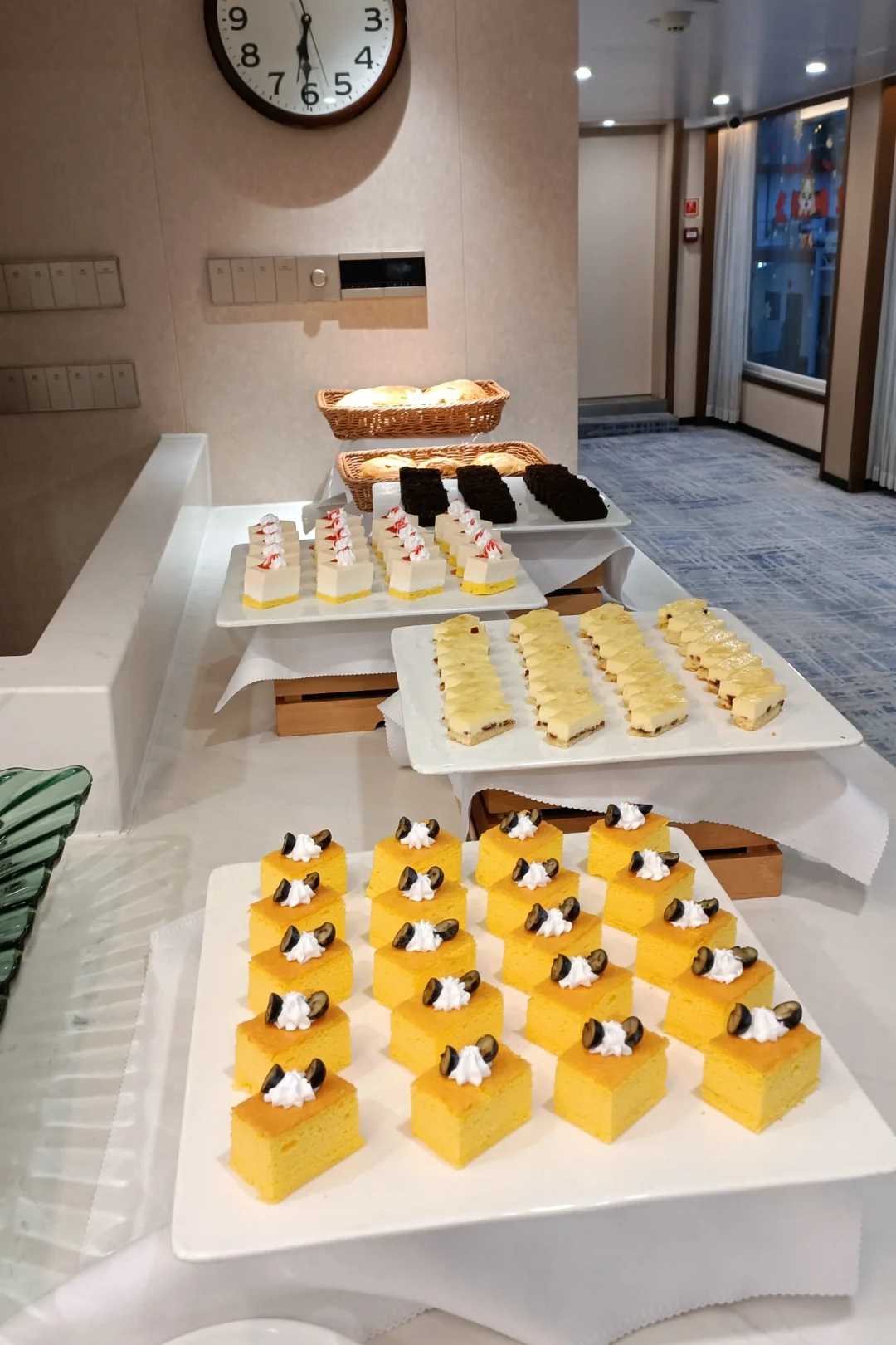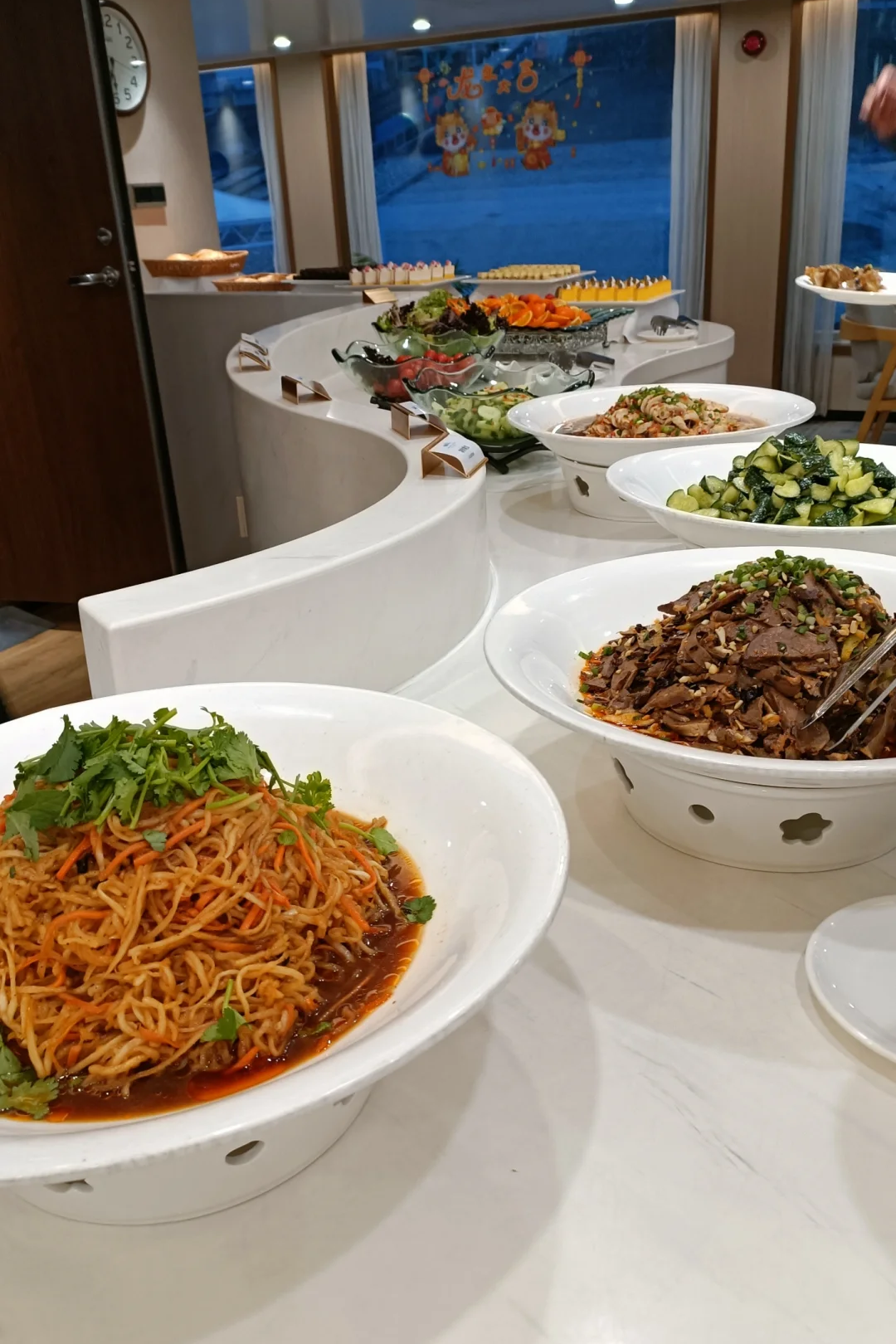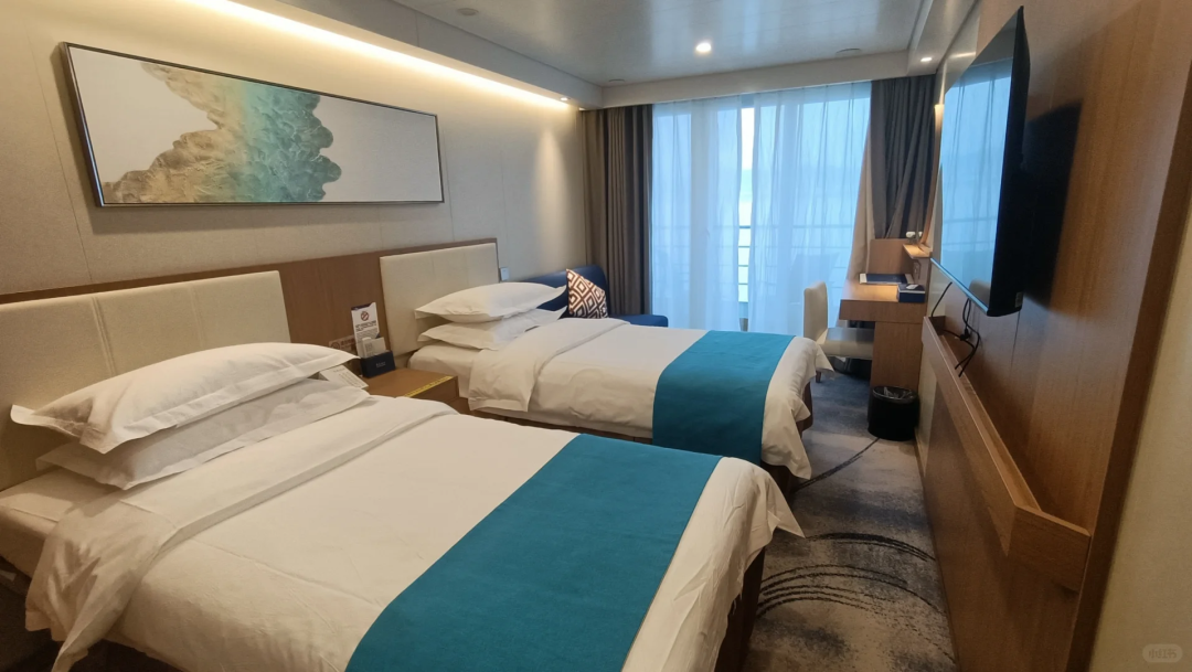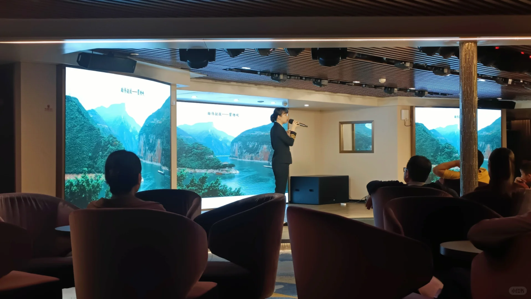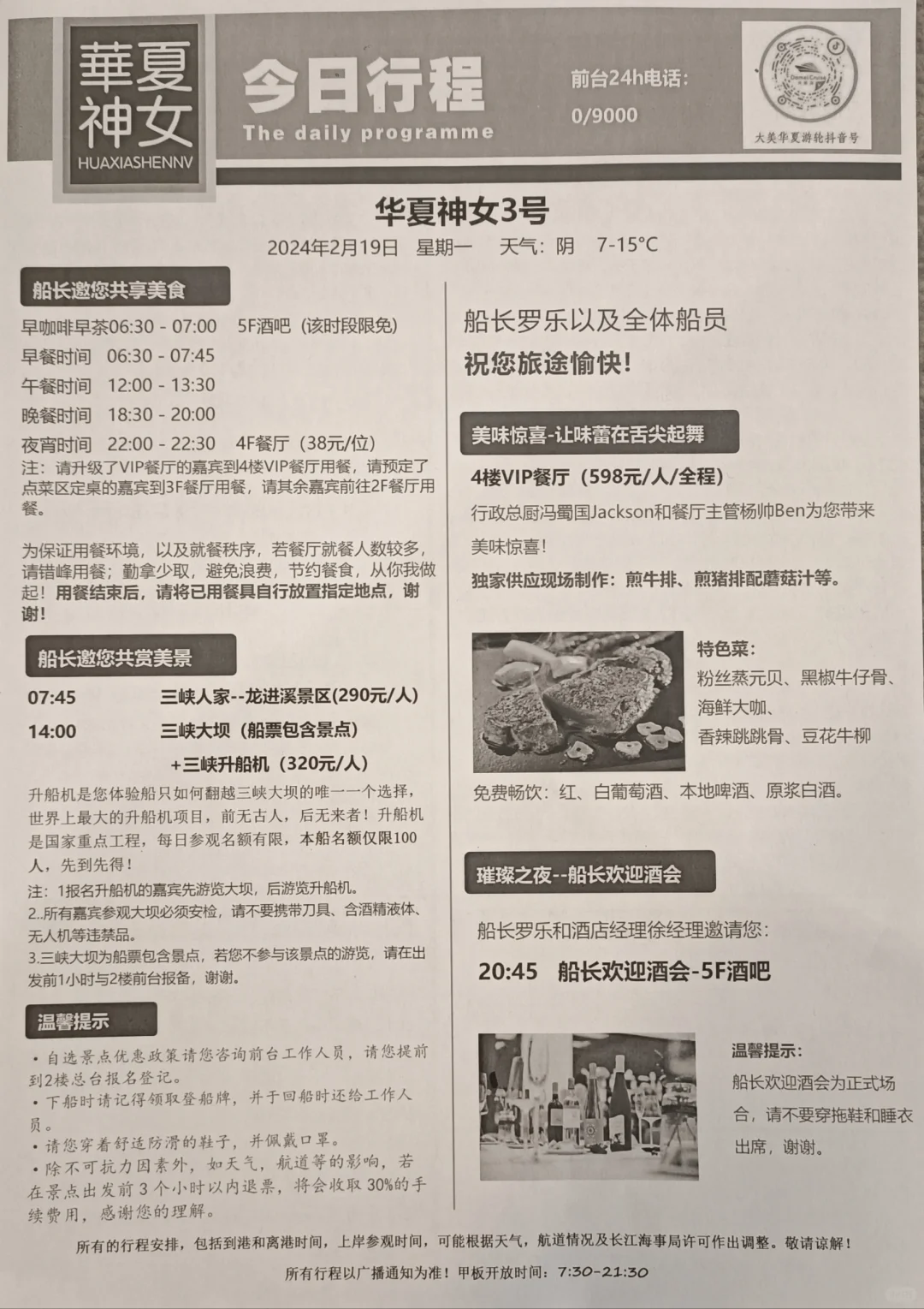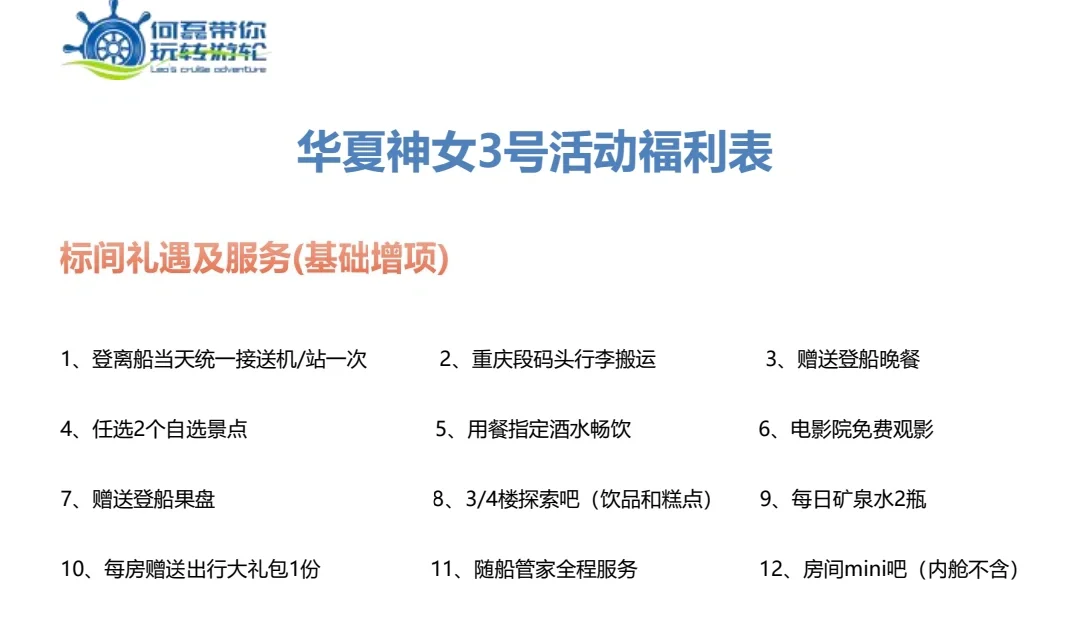 我是在快手上报的“何磊粉丝团”,比较了一下其它渠道船票,个人觉得这个性价比高,服务多,很多贴心设置。粉丝团成员都有管家提前联系,下午四点安排了大巴车在宜昌东站接坐火车到达宜昌的游客。开车大概一个多小时,到达秭归港,从这里验身份证(和坐高铁似的,身份证就是船票),然后坐类似电梯一样的设备,将我们送到码头,不用自己带着行李下很高的台阶。房间很干净,没有异味,粉丝还送了入住水果和饮料,牙刷、牙膏、浴帽、梳子、浴液、洗发水、毛巾、浴巾、拖鞋都有,和酒店配备类似。因为我订的两间阳台房,前台贴心的给我的两间挨着,这样将阳台隔板打开,两个小阳台瞬间连通变成了大阳台。粉丝还赠送了登船晚餐,自助餐形式,糕点,凉菜,水果,热菜,主食,饮料都是有的,粉丝还有啤酒可以喝。晚上房间里的广播通知开会,主要讲解一下游轮旅行过程中船票包含的三个游玩项目(三峡大坝、小三峡、雪玉洞)和自费项目(三峡人家、三峡升船机、小小三峡、白帝城、三峡之巅、大裂谷),因为是粉丝,赠送2个自费项目,我选择了升船机和白帝城。昨天将今天的行程单发到每个房间里,我还从电梯旁宣传栏里拿了行程每天景点安排和自费项目单,给亲们做参考。因为今天没有选择自费项目三峡人家,所以上午没事儿,吃过早饭,可以去三楼甲板溜达,或上7层顶板赏赏风景,还可以到前台领取下船牌,然后到附近的木鱼岛公园转转。作为粉丝,上午十点后,可以去畅享吧去喝东西,作为磊哥粉丝团,可以选择的品种很多:茶、果汁、无酒精鸡尾酒、咖啡等,如果下午去,还有糕点。下午按管家通知,下船,有大巴在码头接,坐大巴去逛下午的船票自带项目“三峡大坝”,先去坛子岭,可以看到三峡大坝全貌,再去185米看台,可以近距离看到大坝细节。因为磊哥粉丝团送两个自费项目,选择了今天下午的三峡大坝升船机,大巴送我们去下游码头,坐上专用长江三峡船,体验“大船的电梯”,送到上游,然后专用船开到我们船旁边,通过连接通道回到华夏神女3号。晚饭后,八点多有船长晚会,磊哥带领着船员们和大家见面,中英双语自如切换的介绍,很帅啊,最惊喜的是磊哥唱歌非常好听,特别有氛围感,后面船员的表演也很热闹!游轮是从第二天晚上船长酒会后启航的,行船过程中没有什么明显感觉,很平稳,不打开阳台门,都不知道船在走。第三天上午是游玩船票自带项目巫山县小三峡,游轮停靠码头,换成二层小船,进入小三峡,欣赏沿途景色,碧水青山,非常壮观。秋天来,据说山上树叶都是红色黄色的,非常好看!船上有讲解,沿途奇山异石都会讲,山崖上还有悬棺!中午送回游轮吃午饭,游轮再次启航,往奉节县开去,午休会儿,下午两点左右路过夔门(人民币十元背后图),客房广播会通知大家上7层顶板观看,还配有讲解员。下午三点半左右,停靠码头,大巴接去游玩下午磊哥粉丝赠送的第二个自费项目——白帝城。