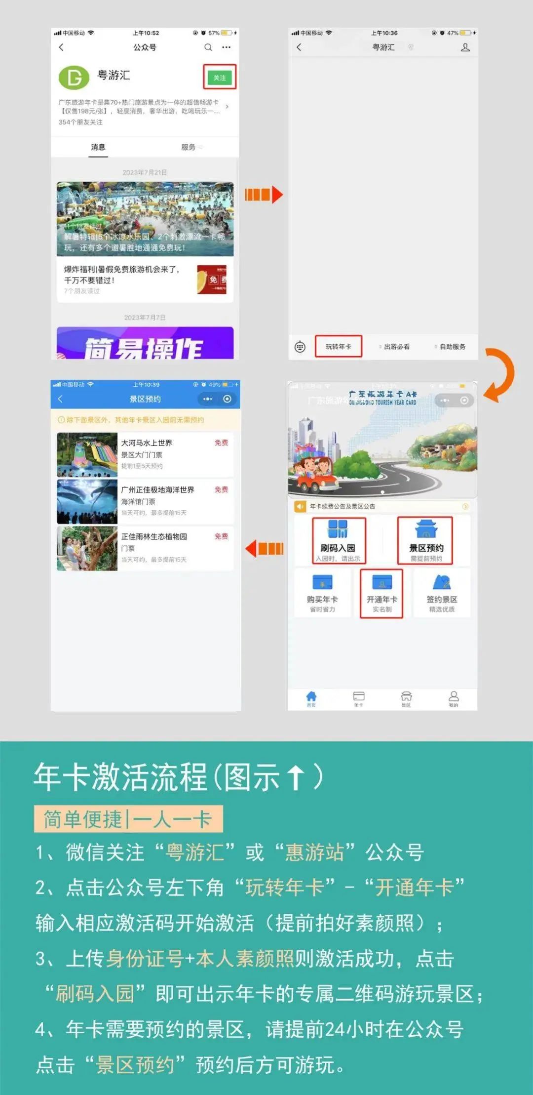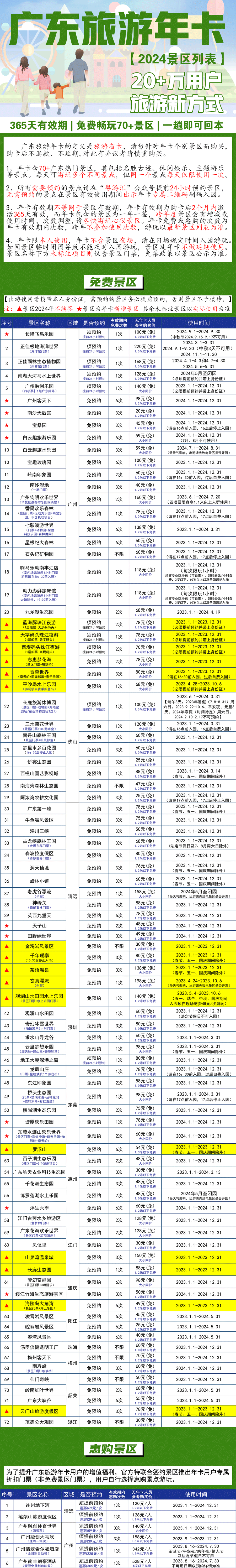 2、大部分的景区全年均可不预约、不限次使用,个别景区有使用时间、次数限制或须预约,出游前请查看“粤游汇”微信公众号年卡公告;年卡内包含的大部分景区1.2米(不含)以下儿童免票,详见景区列表说明,年龄太小的孩子请自行考虑是否购买。