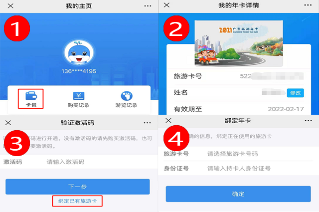 答:进入公众号,点击“用户中心”-“个人中心”,然后点击“卡包”,将需要绑定至其他wx的“旅游卡号52开头”复制下来,然后重新绑定的wx进入“粤游汇”公众号,点击“激活年票”,选择“绑定已开通年卡”,输入身份证和复制的旅游卡号即可绑定。