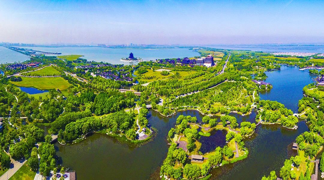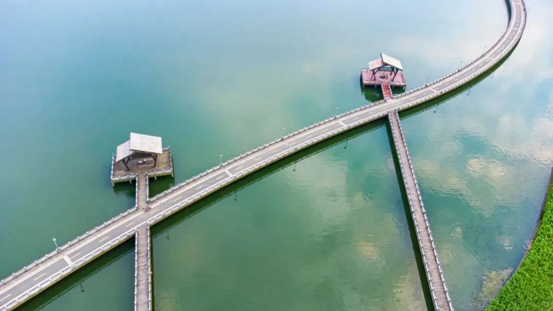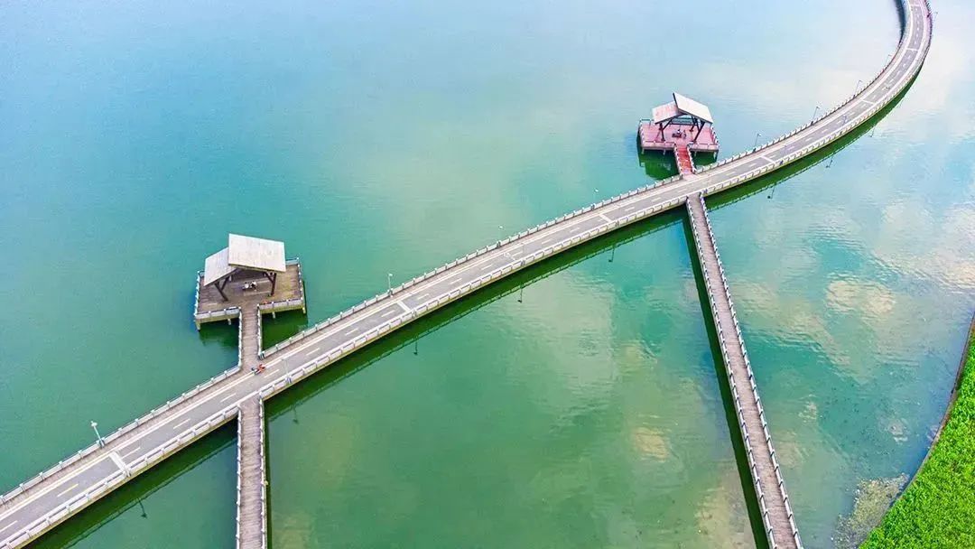 空中俯瞰像一座悬浮于湖上的“绿岛”。