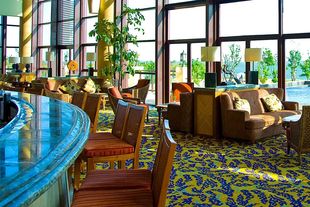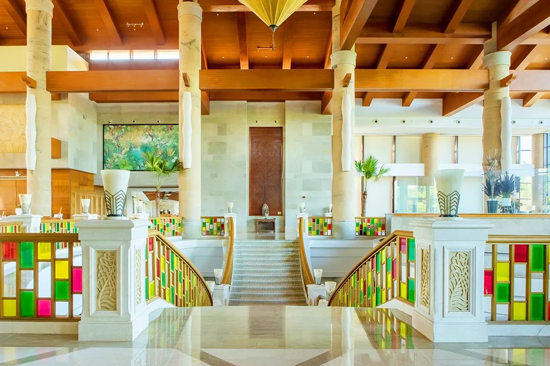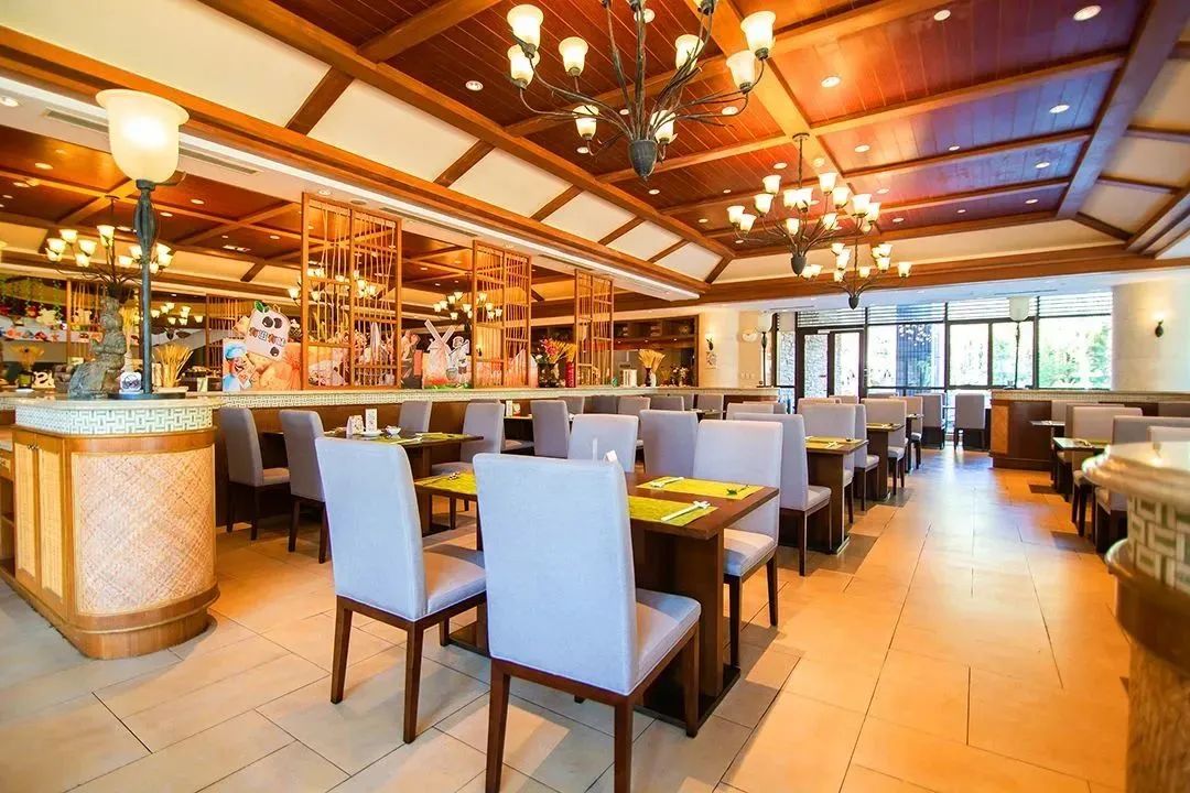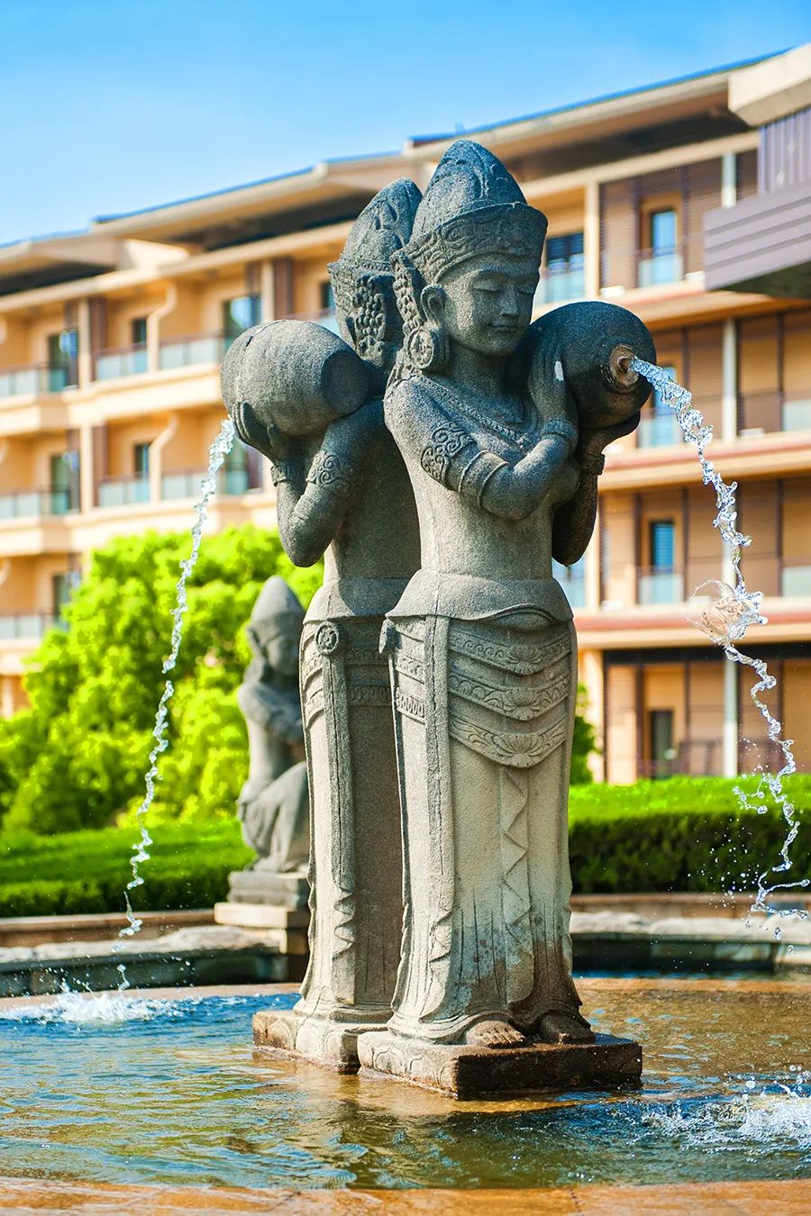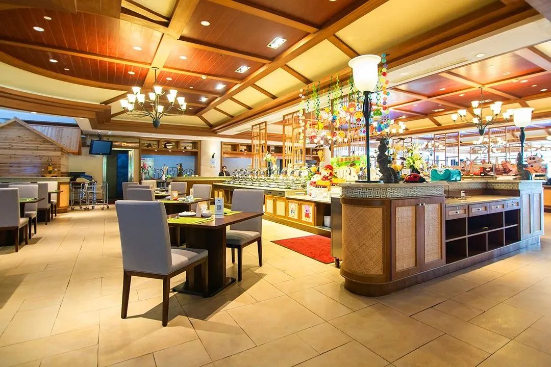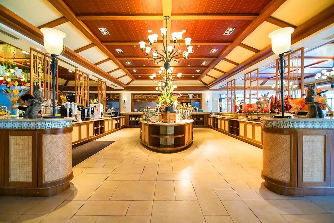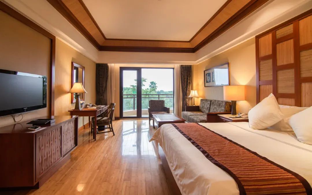 酒店外观与内饰都颇具东南亚风情,棕榈树、绿植花香,大堂内还有搭配藤竹柚木的手工艺品、常年翠绿的宽叶植物,一整面落地玻璃窗外,无边水景,满满异域风韵。