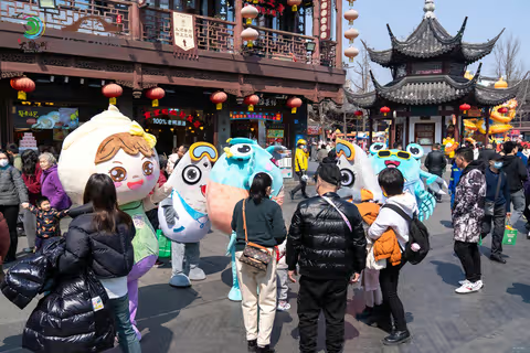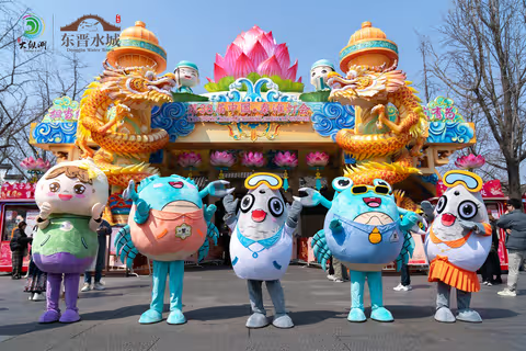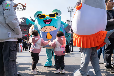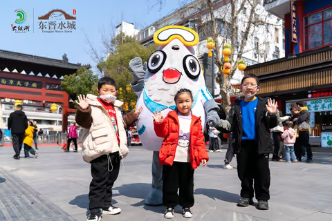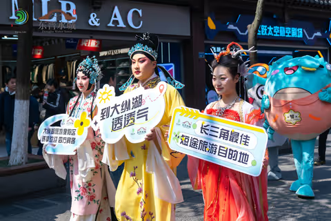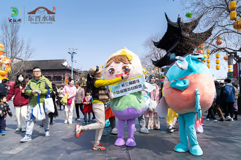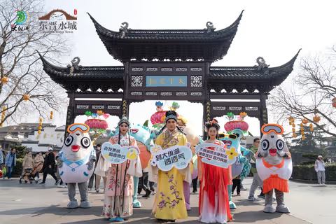 大纵湖吉祥物们——螺小白、白小浪、白小花、蟹老大、蟹小妹纷纷走上南京夫子庙,向市民游客们介绍起大纵湖旅游度假区。