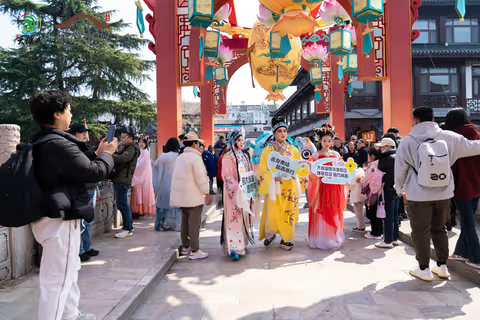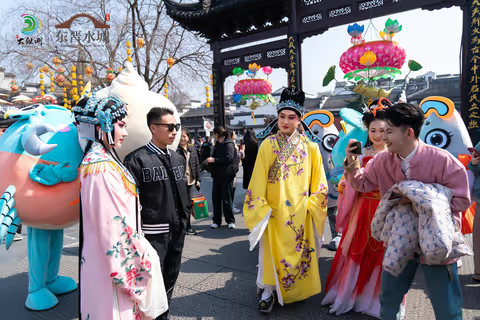 盐都淮剧表演出现在夫子庙街头,吸引了南京市民的目光,游客市民们纷纷前来打卡拍照。