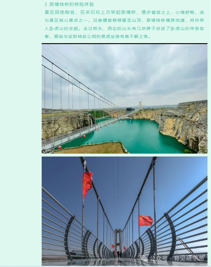 卧虎山还是个露营的好去处,在这里不仅可以欣赏到无限的山水田园风光,也可以体验农家采摘乐趣,此外建设玻璃桥、高空漂流、游乐场、熊熊乐园、萌宠动物园等多个网红项目,配备桂园水舍、书院圣舍、卧虎山居等民宿,供游客住宿餐饮和学生军训研学,适合于儿童、青少年、老人等多个群体。景区现已建设成为国家3A级旅游景区,成为临沂市及周边地区的网红打卡胜地