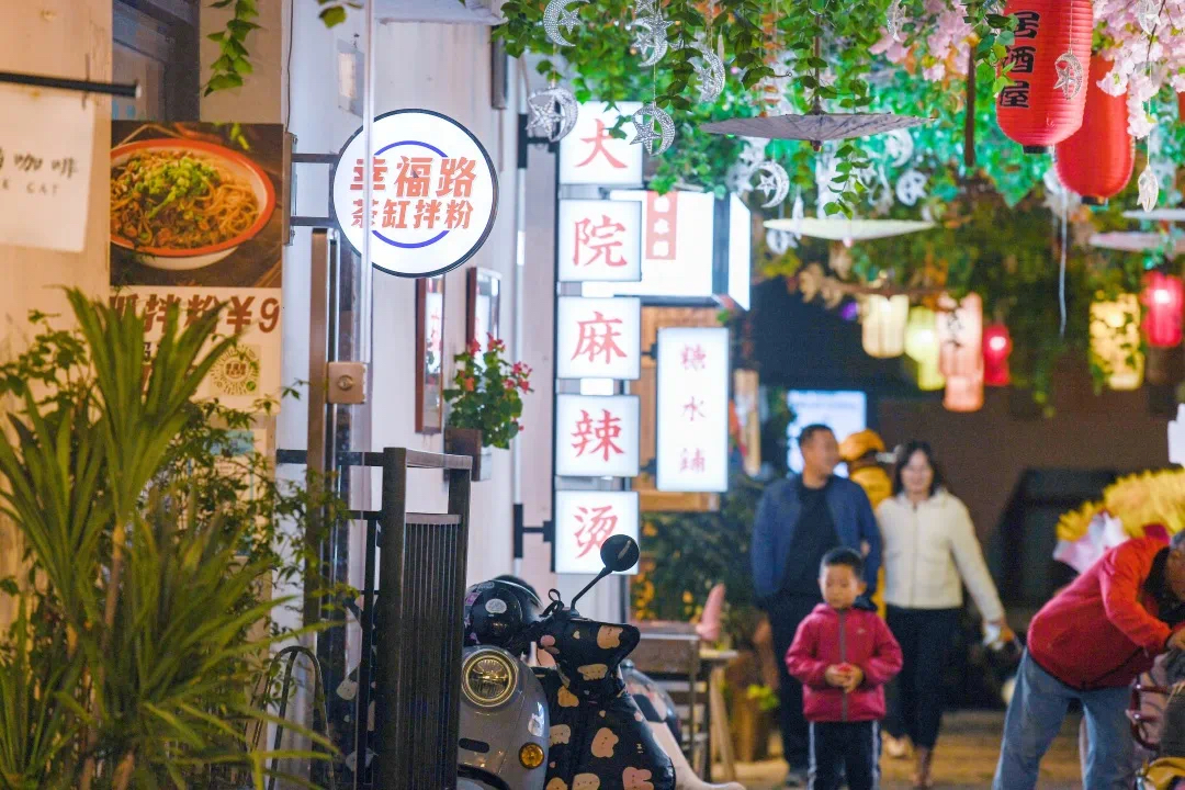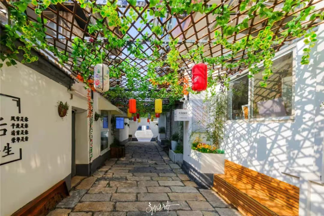 街中装饰有栩栩如生的仿真藤蔓,让街巷中四季皆风景,别致的装饰小物点缀在墙面上,在春日暖阳的照耀下,斑驳的光影与趣味的装饰品交织,氛围感满满,很适合来此拍照、打卡。