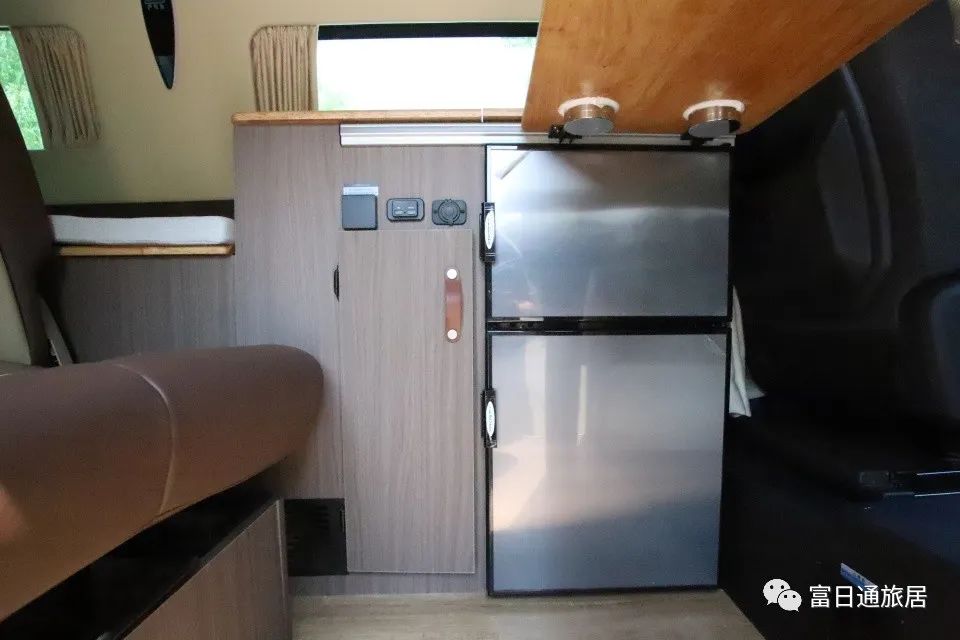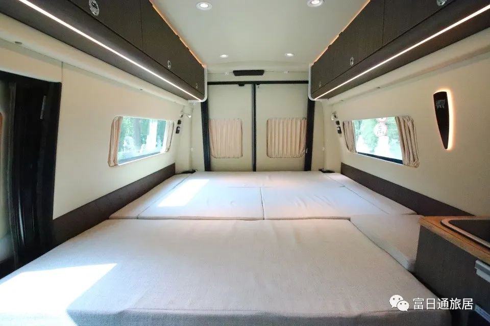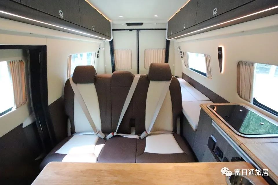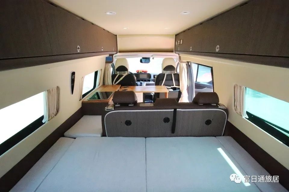 这款床车在车内,采用前后通透设计,一眼望去厨房、主卧、乘坐区、吊装在车顶两侧的储物柜等,每个功能都显示得非常清楚,空间不压抑。另外,在内饰设计上,车内还以黑胡桃色环保板材加米色内饰打造,让用户既体验到居住的舒适感,也兼顾了实用性。一家三口拎包就能入住,轻松愉快地开启假日旅行生活。