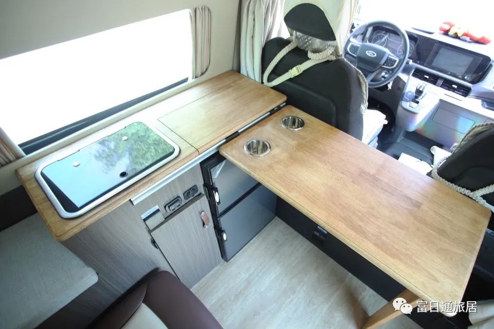 后方厨房设在驾驶室后方,整体采用橡木实木加黑胡桃板材组成,防水防腐设计,空间大又独立,并配有翻盖式洗菜池、储物柜、85L双开门冰箱、便携式壁挂桌等设备。