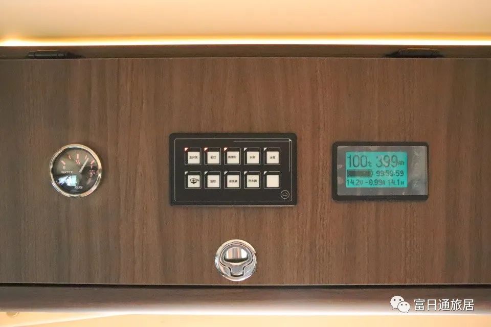 座椅右侧车门上方,为这款床车的水电管理显示面板总成区域。在水电方面,标配有415Ah锂电池、3000W充逆变一体机、400W太阳能电池板、100L清水箱以及45L灰水箱。对于短途游来说,水电配置完全能满足一家三口的生活所需,不用增配。