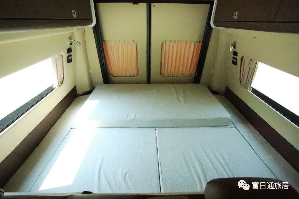 除了厨房和卡座区,后部一半的空间,全部为主卧。整张床在不打开的情况下,长宽达到了1600*1300mm,拓展开后尺寸将达到2100*1650mm,睡3人空间都富裕。这也是很多人喜欢床车的优点所在,床够大,睡着舒服不憋闷。