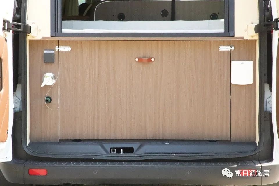 作为一款床车,这款并没有提供卫生间,所以想要洗澡上厕所,也不是没有解决办法。得益于车尾双开门和车门内侧隐藏的用水系统等硬件设备,用便携式浴帘组合车门,形成临时的洗漱区,来满足旅行中洗澡等需求。