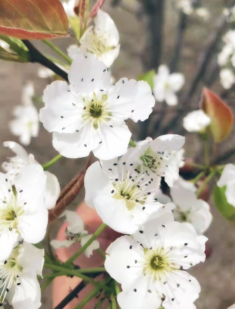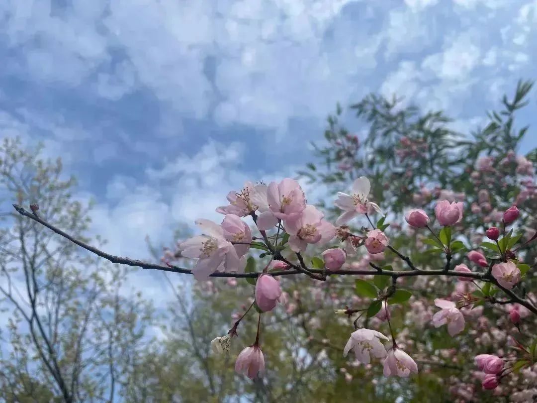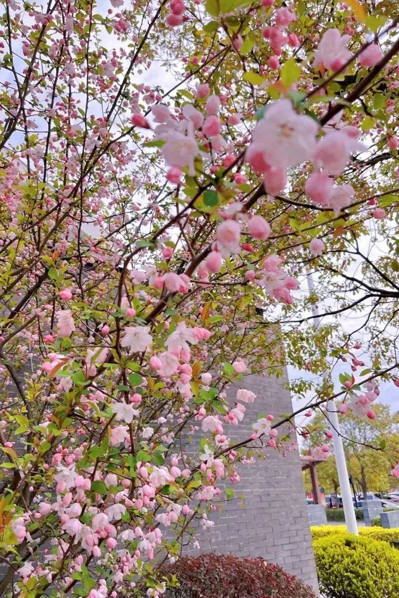 竞相吐蕊,粉色、白色花满枝头