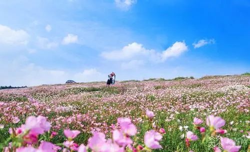 彩色的花海与蓝天白云交相辉映