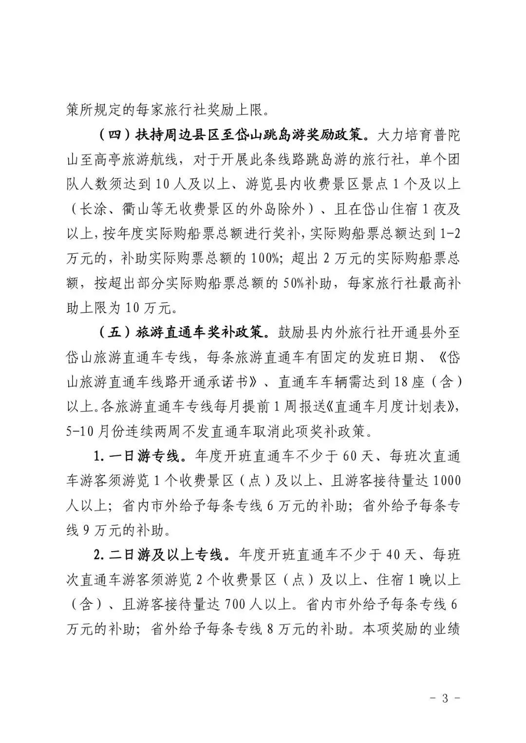 对于开展此条线路跳岛游的旅行社,单个团队人数须达到10人及以上、游览县内收费景区景点1个及以上、且在岱山住宿1夜及以上,按年度实际购船票总额进行奖补,实际购船票总额达到1-2万元,补助实际购票总额的100%;超出2万元的实际购船票总额,按超出部分实际购船票总额的50%补助。