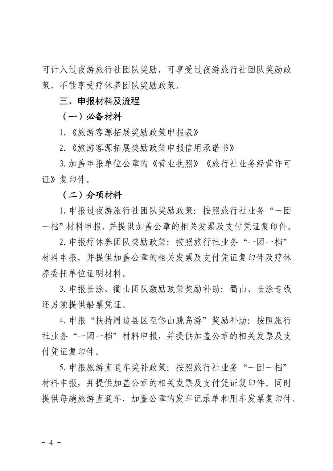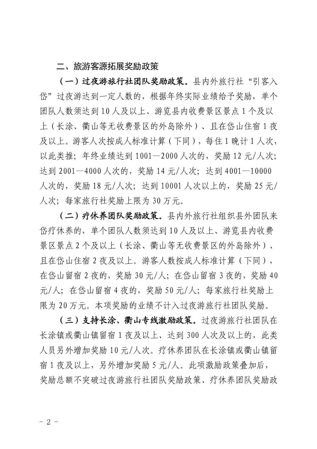 过夜游旅行社团队在长涂镇或衢山镇留宿1夜及以上、达到300人次及以上的,此类人员另外增加奖励10元/人次。疗休养团队在长涂镇或衢山镇留宿1夜及以上,另外增加奖励5元/人。