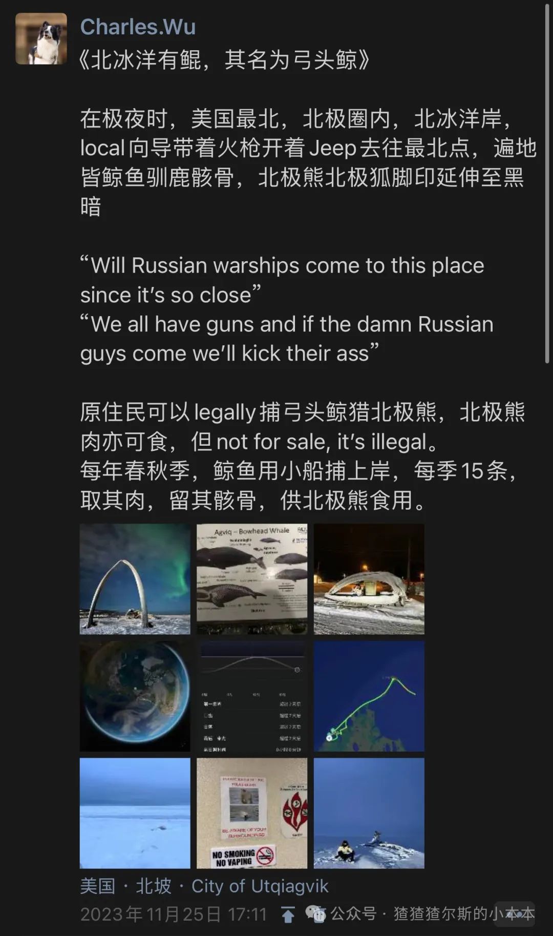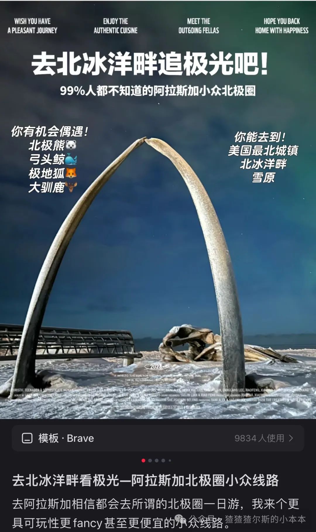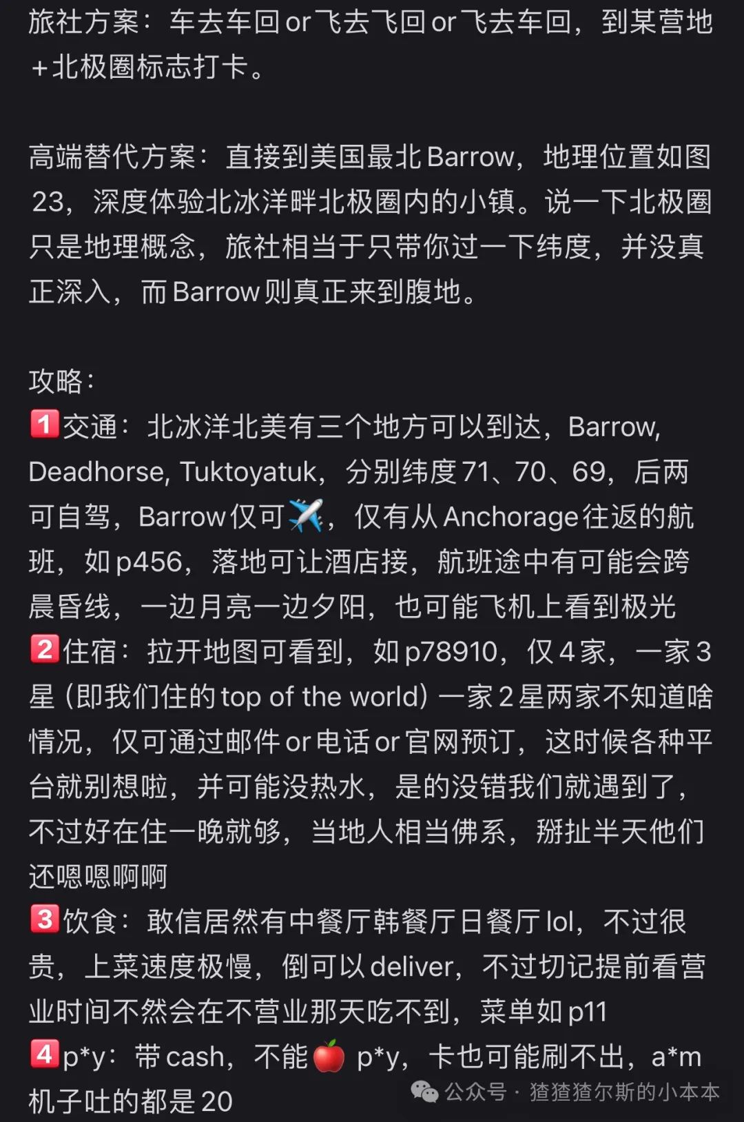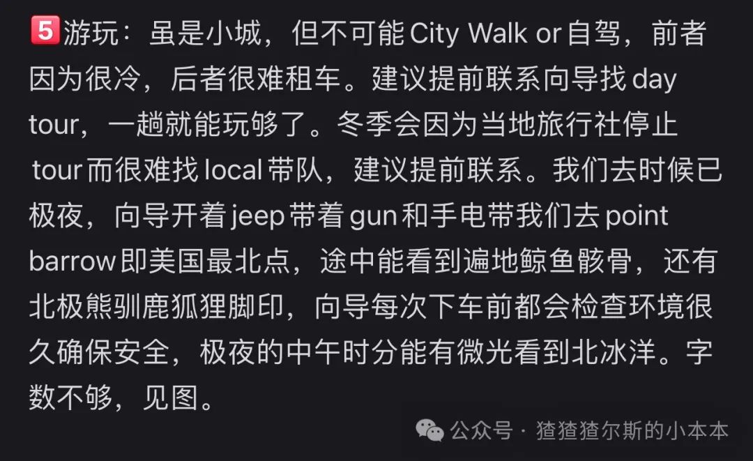 极光肉眼看是奶绿色,开启录屏之后录照相模式的屏幕有奇效~看极光真的是3分看强度7分靠天气,出发前祈祷一下别天天阴天hhhDay2:Denali mini trekking,第二次极光观测。首先先来个小结论,Denali在夏季的可玩性远大于冬季,夏季可以乘小飞机落在冰川上,也有机会看到北美最高峰Denali峰,也是徒步的好去处。但是,秉持着中国人传统美德来都来了,冬天也要好好玩才对,OKfine,那就是这天的标题了。找个旅行社抱个小徒步团,强度真的很友好,稍微走走就能看到不少景色了,就是来回车上有点困🥱,不过还是很出图的就是了。Day3:狗拉雪橇/雪地摩托/冰面钓鱼/温泉,第三次极光观测(要是三天还看不到就放弃吧hh。这个见仁见智了,我本身对于这些活动属于是可去可不去的心态,但是还是一句话,传统美德来都来了那就去去吧,尤其点名Chena(去的shuttle的暖气不要钱的😇,坐的我一屁股的汗md),如果是没有拍照(拍头发结冰照🥵)需求或者对温泉不感冒的可以直接skip,imagine: In USA, there's a hot spring full of Chinese boys taking pics for their girlfriends. Therefore, we also call it China hot spring.来都来了体验一下雪地活动吧~不过狗拉雪橇后面会说高配版~另外加一句,别乱和🐶互动,有些傻逼🐶会咬人😅Day4:如果蓝冰洞又开发出新的了的话,也可以多留一天去那,我们去的时候蓝冰洞塌陷了,所以这里其实少了一天行程。Day5:FAI—ANC—BRW,飞往美国最北的、北极圈内的、北冰洋畔的小镇Barrow。若运气好,在Barrow也是可以看到北极光的,更凄凉末世的感觉,运气更好还能被北极熊追😊高配版北极圈行程,全方位高替旅行社的北极圈一日游,综合成本并未高出,但是体验拉满。这个绝对是旅行社只字不会提的,因为太原始偏远的地方了无利可图了LOL。Day6:找local guide坐jeep去美国最北点,完事之后晚上飞回Anchorage。指路我自己小红书写的攻略行程,我是强推一定去此处的,once in your lifetime adventure~初夏去还能赶上鲸鱼节。再放一下我的朋友圈截图,阿拉斯加行程最爱的地方没有之一~幸运仔可以喜提偶遇北极熊,但是运气一般也能看到北极熊、鹿、狐狸脚印和鲸鱼骨架。Day7:抱团参加Matanuska Glacier hiking,如果在Fairbanks去过蓝洞可以不去,去过别的冰川的也可以不去,我因为自己没能去到我就直接放我在阿根廷的Perito Moreno Glacier的照充数了。但其实两者风景差异很大,尤其是两者的游览季节其实有差异。Day8:去阿拉斯加湾放一首阿拉斯加海湾吧。途中可以去一下北极地区动物保护中心。冬季的阿拉斯加湾基本上就是孤独星球感觉,很适合阿拉斯加海湾放着然后主角掉小珍珠🙂。去的方式也很简单,开车去到Seward的黑沙滩。至于我为什么一定要去放阿拉斯加海湾,那这个或许和我穿着Patagonia去爬Patagonia是一个原因吧,抽象人的逻辑无需多言。补一句,比较养老的景色,很适合去郁郁。夏天可玩性很高,因为那边是Kenai Fjord,可以坐游船出海,很适合躺平度假。Day9-10:早上飞往狗拉雪橇第一城Nome,authentic的狗拉雪橇文化体验之旅。不好意思,我这里没去,时间不够了😬,但是我觉得是很值得去的,是的没错,我的直觉不会骗我的。在纽约中央公园的一条小径旁边,有一只雪橇犬的铜像。路过的游人不时会被它所吸引,驻足观看,拍照留念。 雕像底座镶有一块铜牌子,刻着如下的字样:"Dedicated to the indomitable spirit of the sled dogs that relayed antitoxin six hundred miles over rough ice, across treacherous waters, through Arctic blizzards from Nenana to the relief of stricken Nome in the Winter of 1925. Endurance • Fidelity • Intelligence"Nome在当年也是淘金热的小镇,淘金的遗迹遍地都是。此外Nome与俄罗斯隔着白令海峡对狙,海边的风景在非冬季也很不错。不放图了,不然还要版权声明,随便搜搜就有,小红书去的人还是太少了……随便放张Googlemap凑数,不放图不代表不值得去Day11:OME-ANC-JNU,赶路的一天,去往另一个神奇的城市Juneau,也是阿拉斯加的首府。又是个想去但来不及去的,准备摆烂少写点,但还是那句话,我不写不代表不值得去hhh。Day12:找艘船去观鲸,冰川就不去了,毕竟去了Matanuska了。与美国本土其他州的首府不同,Juneau是一座陆上孤城,没有道路与其他城市相通。进出城市,要么乘飞机,要么坐轮船。观看冰川与观鲸,则是Juneau最吸引人的旅游项目。这里有世界上最佳的观鲸海域,每年来观鲸与看冰川的游客,数以百万计。大的旅游公司,需要提前一年预订游船。而更多的本地旅游业者,则直接在码头上摆摊招揽生意。Day13:回到Seattle,后续回家怎么回应该不需要我指点了对吧🥹