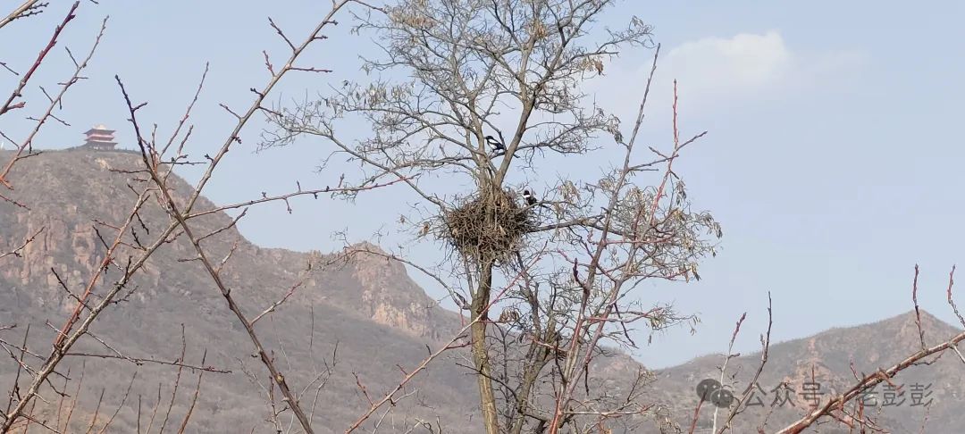 今天太阳很大很暖和,台阶旁边的一棵树上有两只喜鹊正在搭窝。