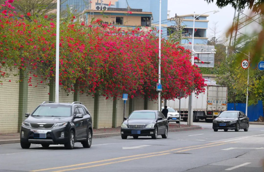 每年一到花季,三角梅围绕着徐福记厂区围墙绵延5公里,开满几条街,像一条长长的花海瀑布,吸引人们来这里拍照打卡。