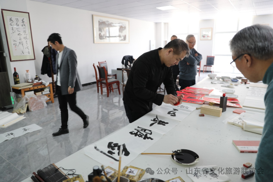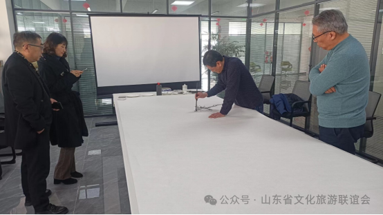 第二天,考察团参观未来美术馆,与胶州市书画家深入座谈,并举行笔会交流活动。