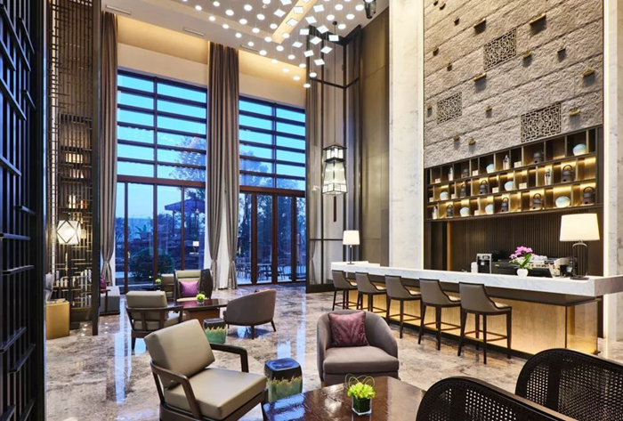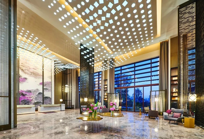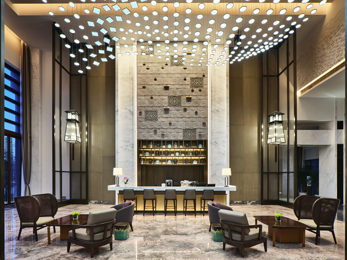 走进大堂,很快就能感受到“传统水乡”的优雅氛围,以水为脉络的大堂灯饰,温婉优雅,镂空屏风式的窗棱,色调沉稳。