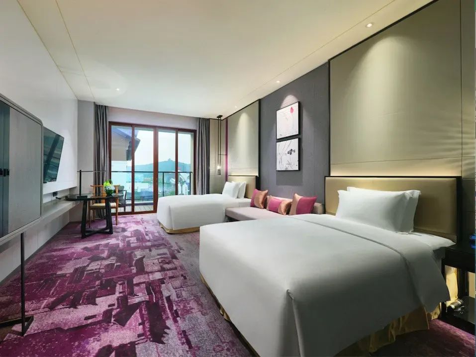 整个酒店拥有293间新中式风格的客房及套房,50㎡起,空间大,还配有阳台,可见酒店园林美景,入夜可看融创夜色。本次套餐入住的是皇冠高级大/双床房。