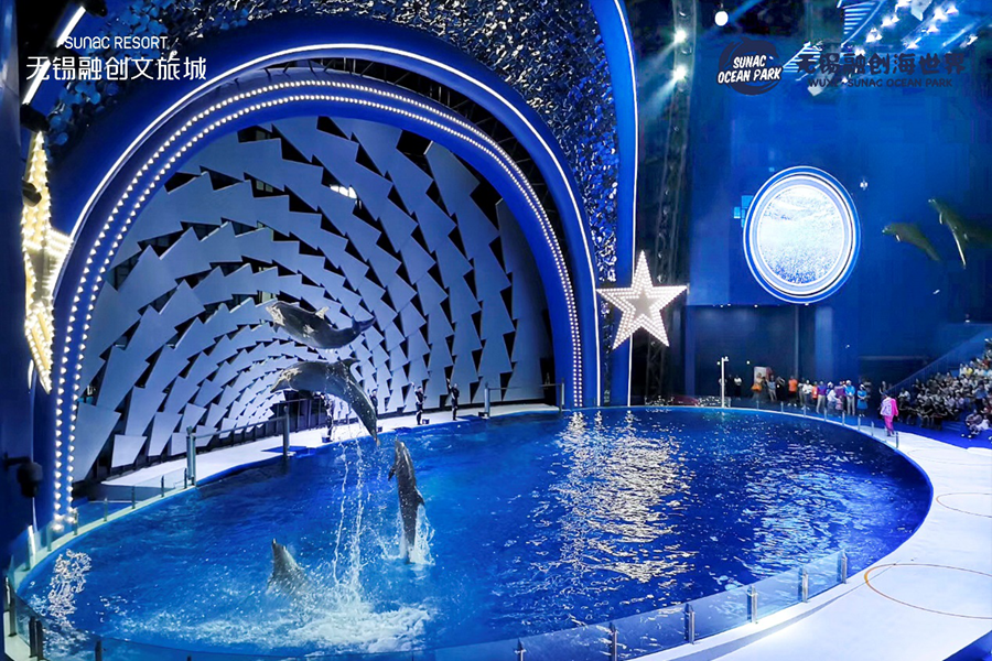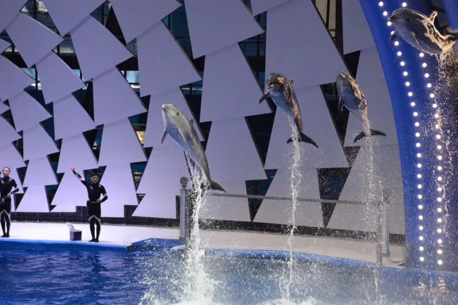 表演区看海豚海狮秀、白鲸之恋、人鱼传说...
