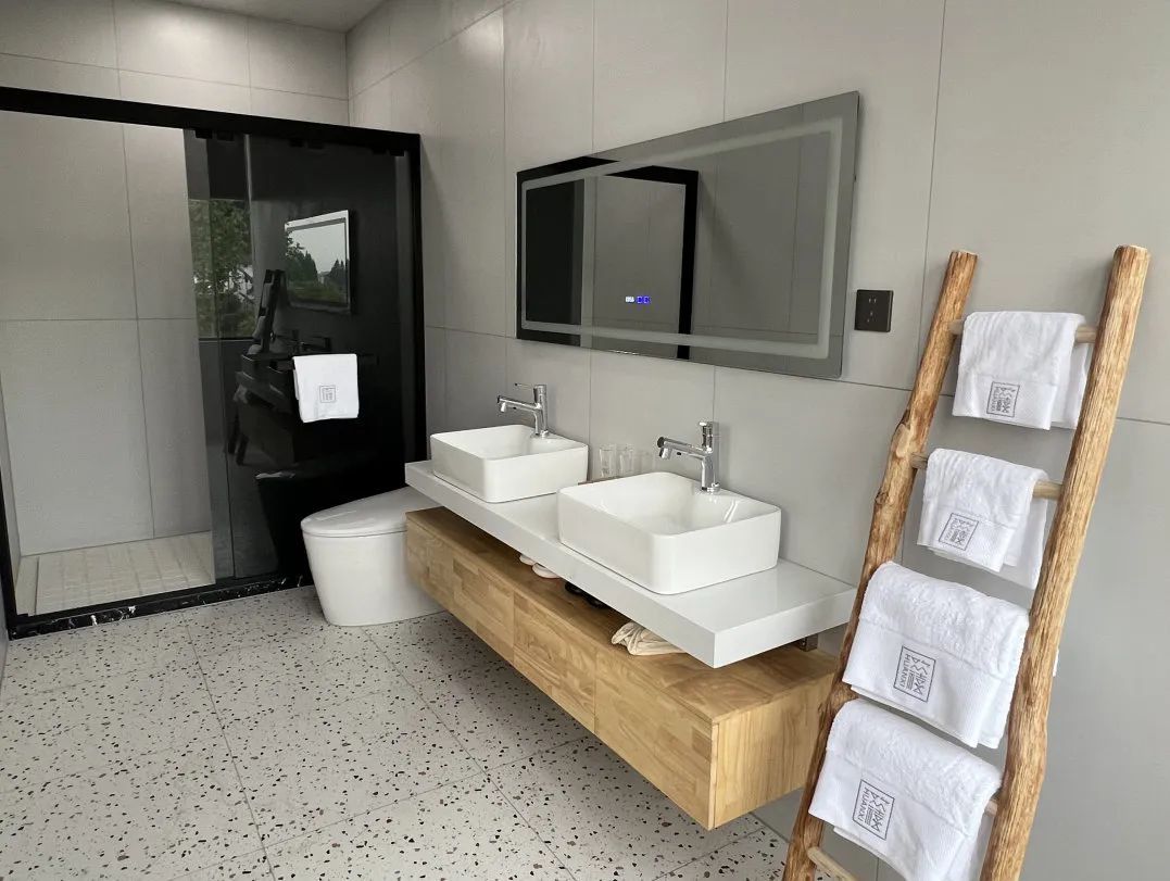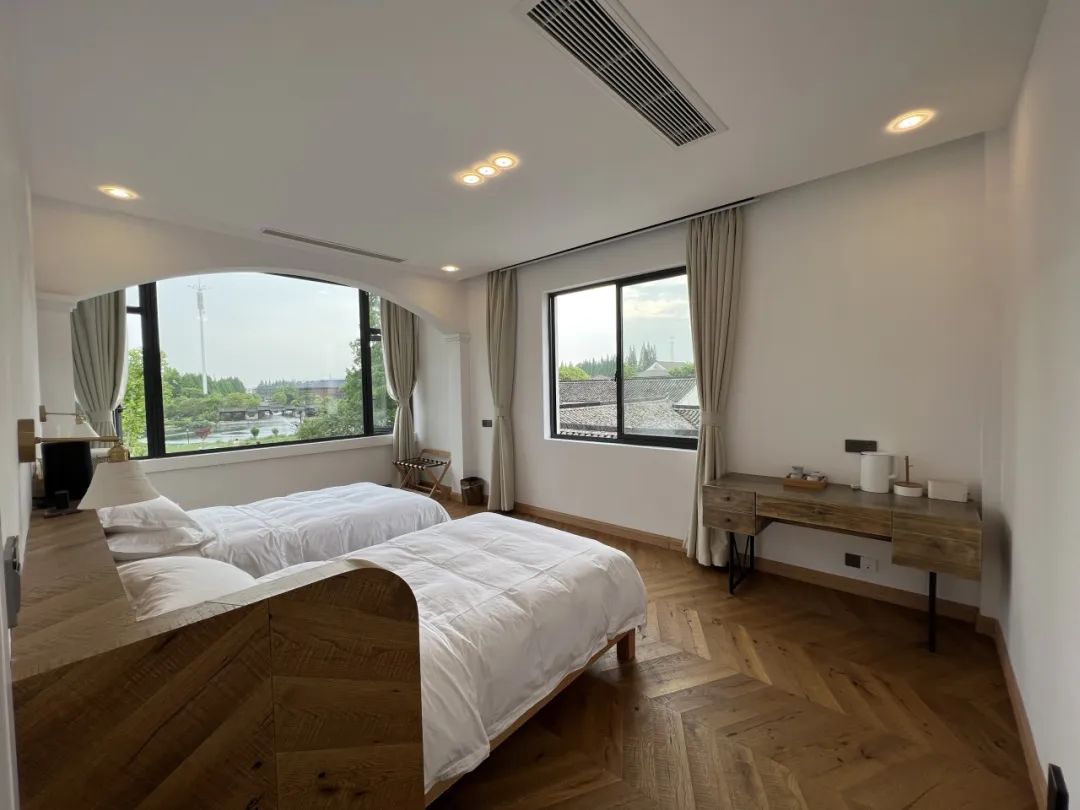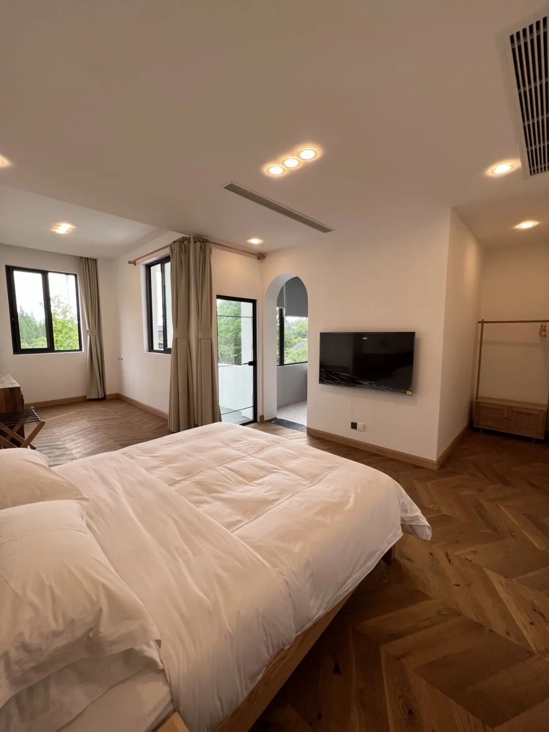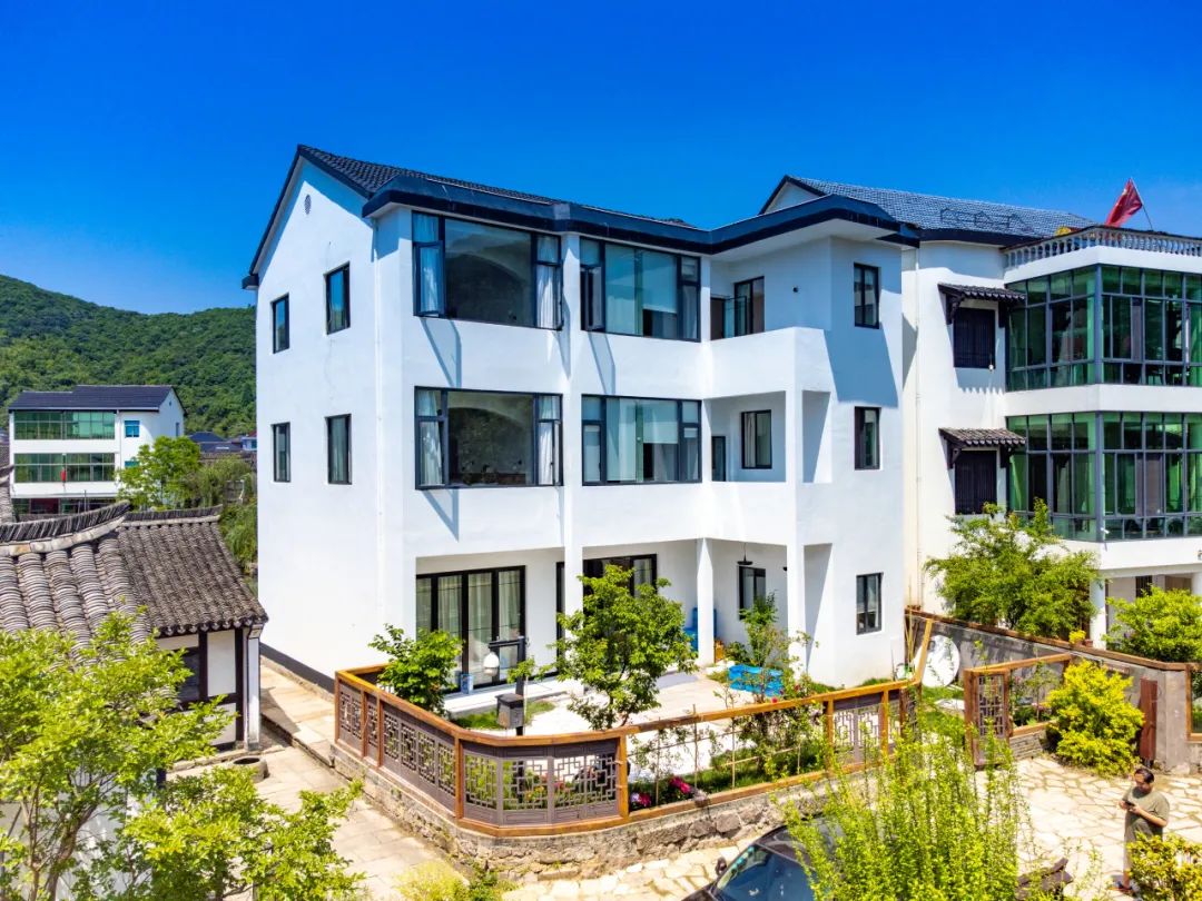 走过咖啡屋,穿过石子路,“欢禧”民宿便浮现眼前。它是古朴沉静的:白墙黑瓦、竹篱院墙、陶罐绿植……又是时尚现代的:客房采用“水泥灰+原木”,电子影音设备齐全,卫浴设施高端……让游人在绿水青山中享受宁静,在蓝天白云间行走呼吸,在乡村农家里休闲度假。
