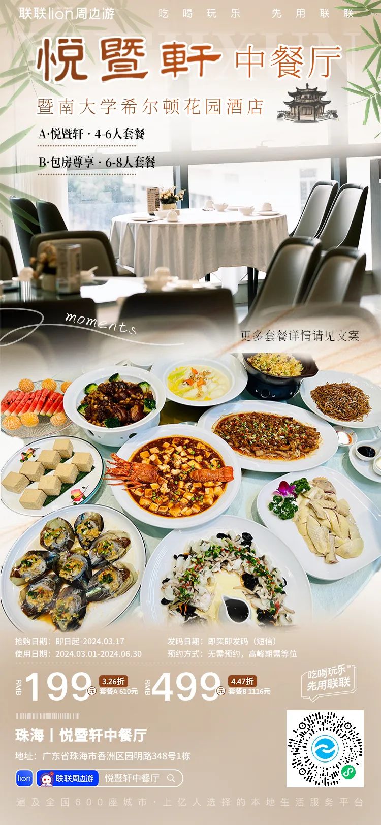 【悦暨轩中餐厅丨暨南大学希尔顿花园酒店】仅199元享【悦暨轩开业钜惠4-6人套餐】;499元享【悦暨轩包房尊享6-8人套餐】