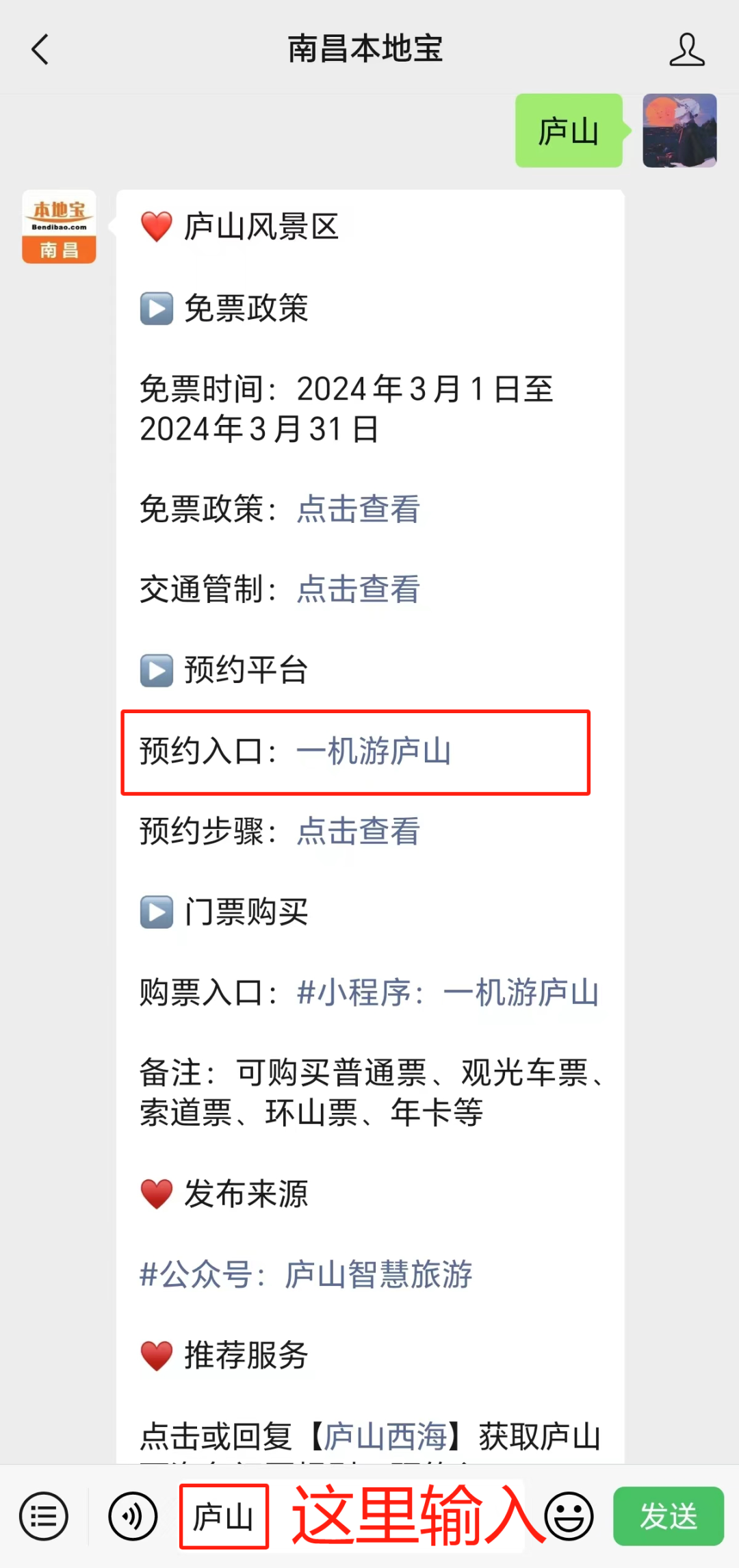 点击下方卡片,关注【南昌本地宝】公众号,点击发消息,在聊天对话框发送【庐山】即可直接获取庐山风景区预约入口。