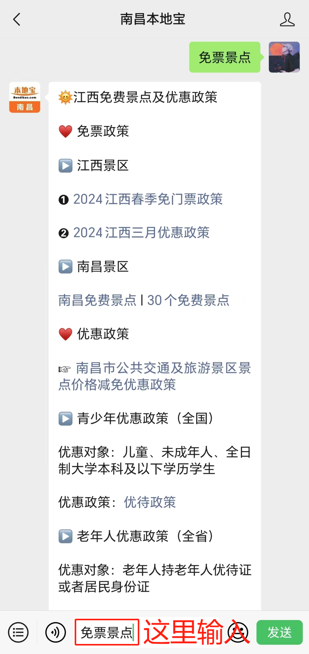 南昌本地宝推出非常多的实用功能,进入公众号里,点击发消息,在对话框内输入并发送对应的【关键词】,即可获取详细的内容!【❎不是留言区】