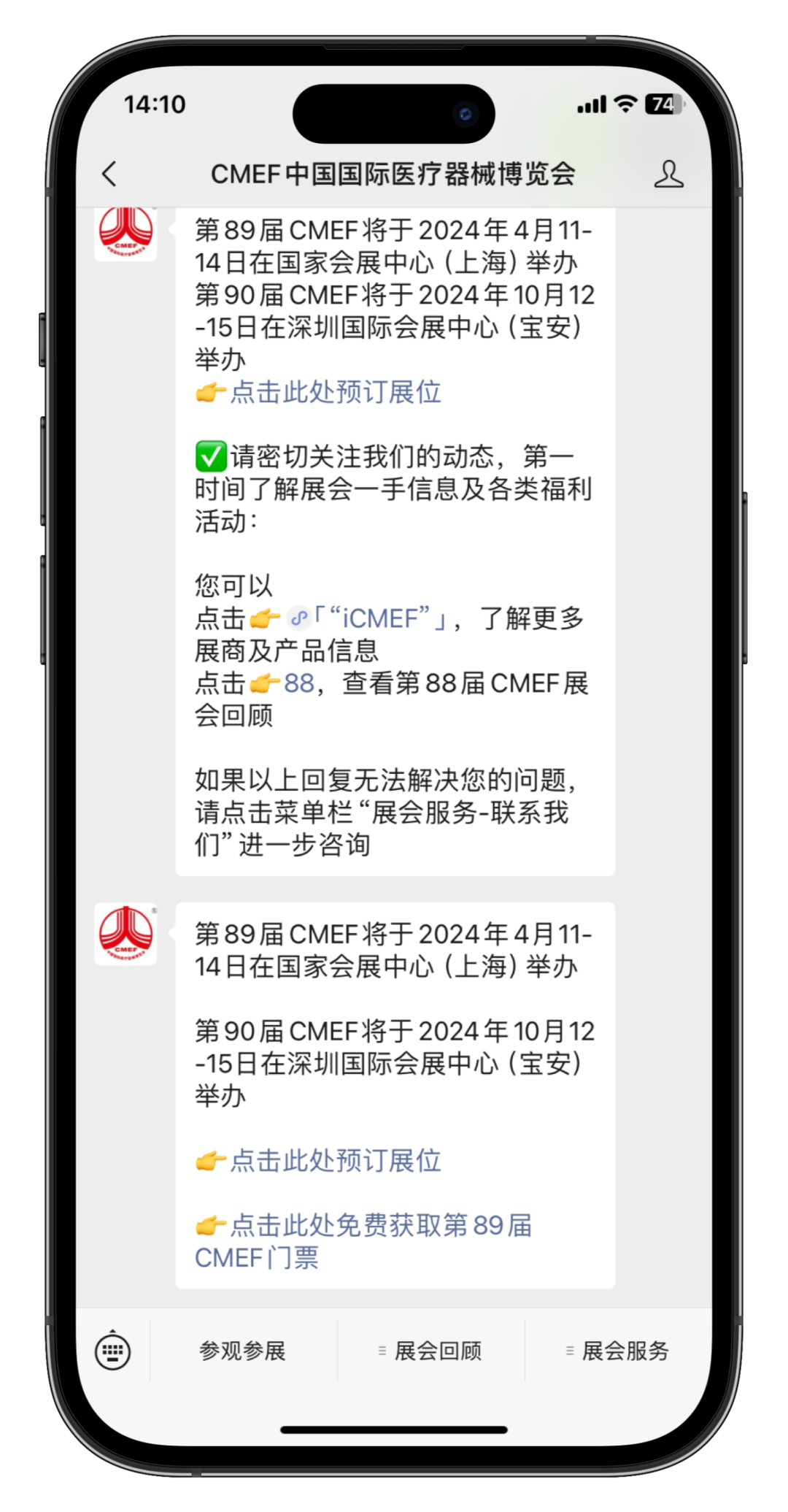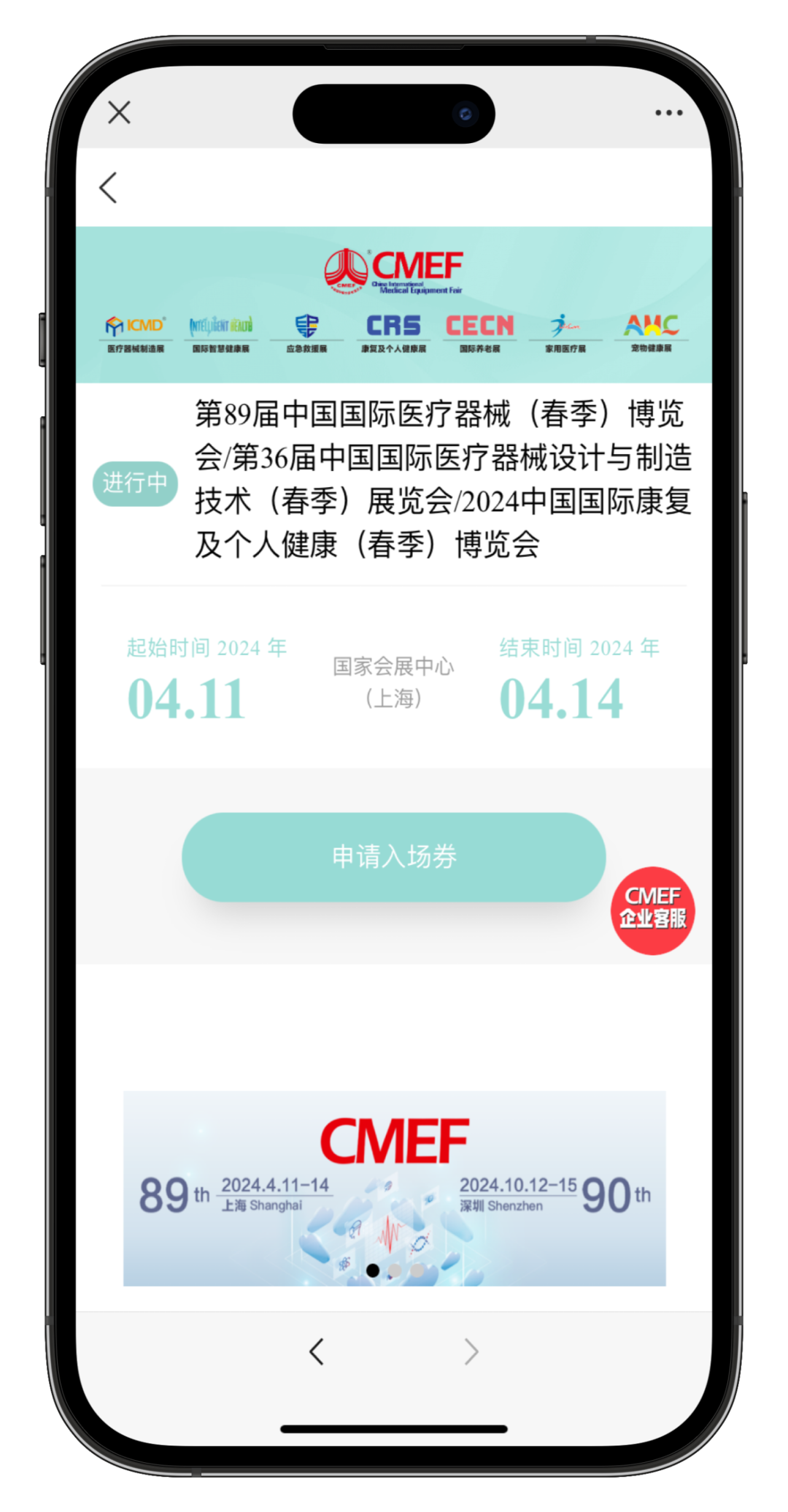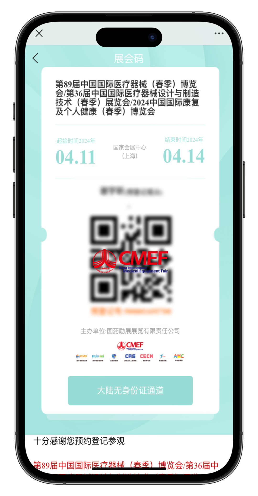 扫描门票二维码或关注CMEF官微点击下方[参观参展]后点击[申请入场券]