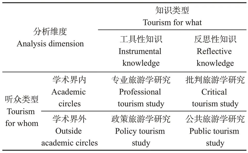 “他山之石,可以攻玉。”美国社会学家布洛维(Burawoy)按照听众类型(学术界内与学术界外)和知识类型(工具性知识与反思性知识)两个维度,把社会学划分为专业社会学、政策社会学、批判社会学和公共社会学4类[31]。借鉴这个分析框架及其在中国社会学的应用经验[32-34],或许可以把一个“有生命力的旅游学”(living tourism)视为4种基本形态的有机组合(表2)。