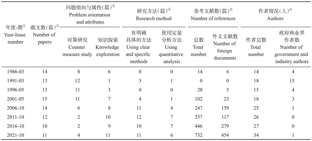 鉴于旅游期刊文献数量巨大,本文选定国内最具代表性的《旅游学刊》作为观察对象。《旅游学刊》创刊于1986年,季刊,1992年改为双月刊,2006年改为月刊。笔者采用抽样方法(间隔5年选取一期,改为双月刊前选第3期,改为双月刊后选第5期,改为月刊后选第10期),对选定期次的每一篇论文进行问题指向与属性、研究方法两个维度的判定,并对参考文献和作者情况做简单统计,汇总形成表1。从中可以得到如下发现。