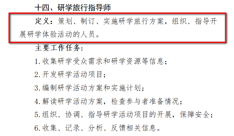 该新职业的主要工作任务包括:收集研学受众需求和研学资源等信息;开发研学活动项目;编制研学活动方案和实施计划;解读研学活动方案,检查参与者准备情况;组织、协调、指导研学活动项目的开展,保障安全;收集、记录、分析、反馈相关信息。